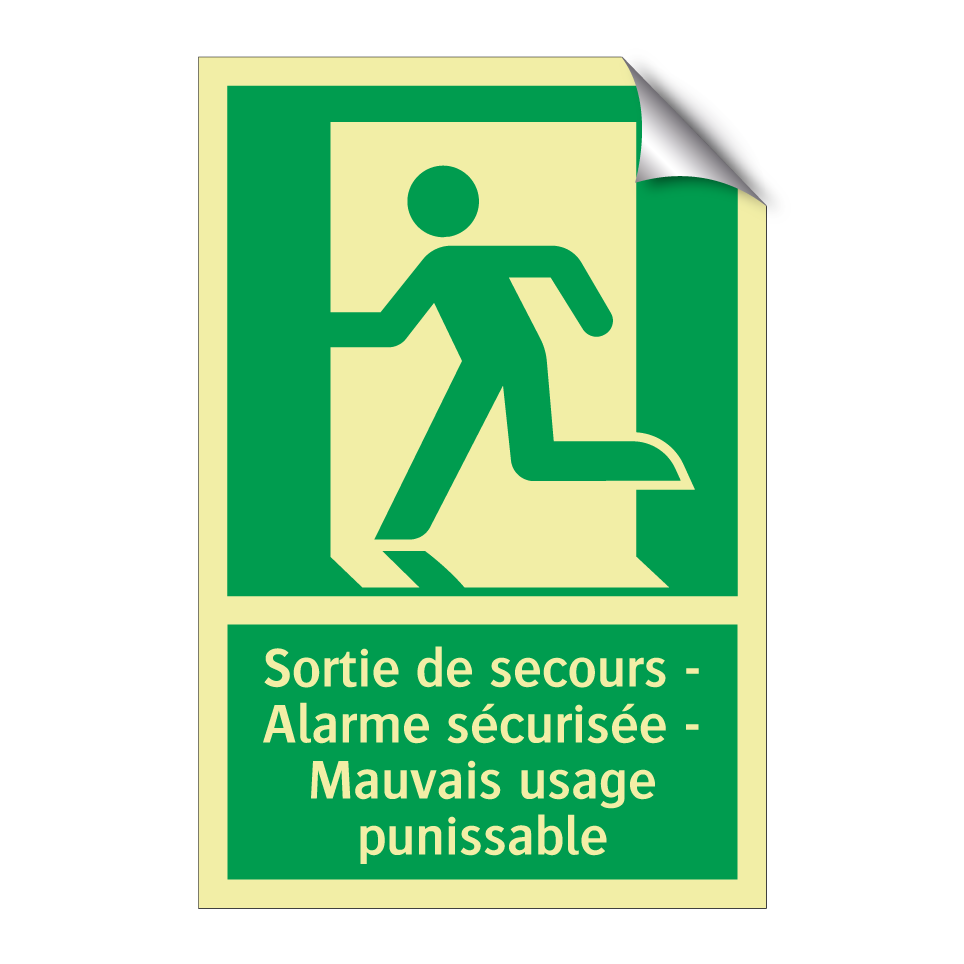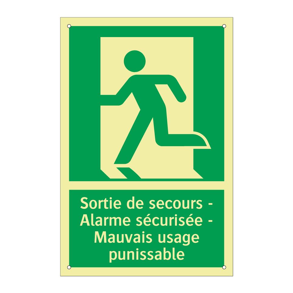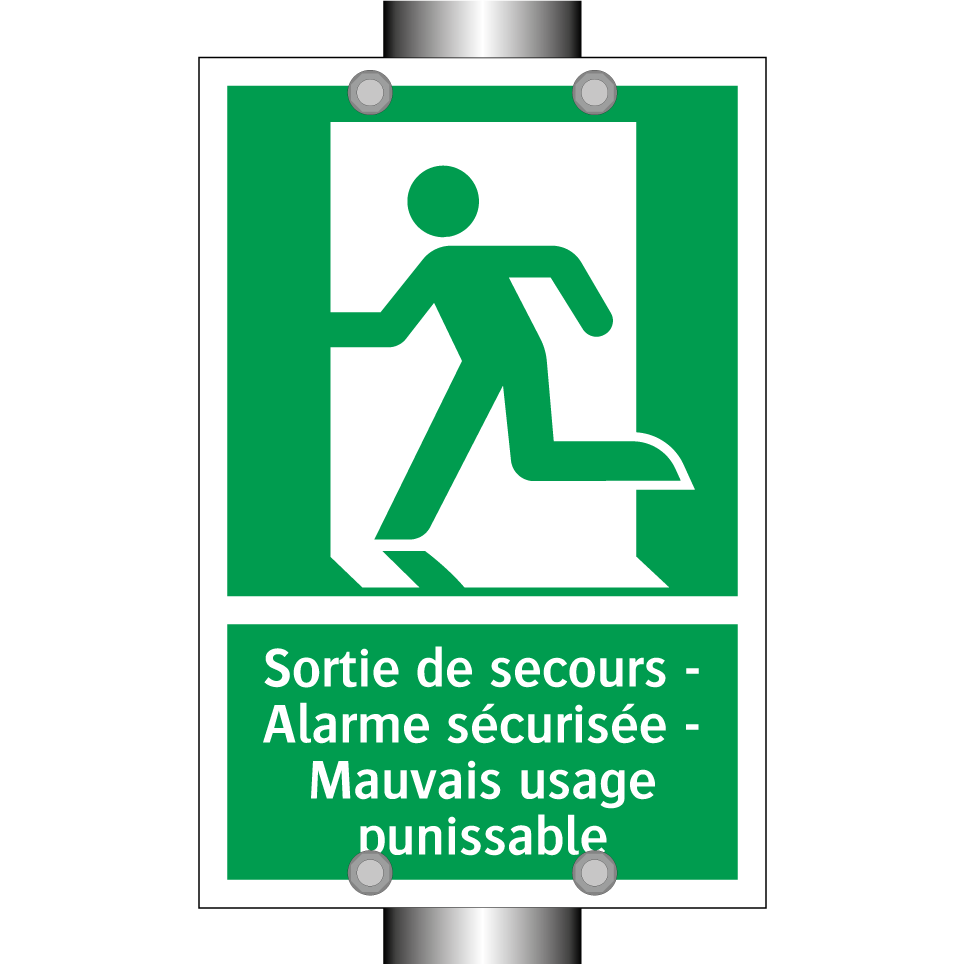 Panneau de secours avec le texte Sortie de secours - Alarme sécurisée - Mauvais usage punissable et une symbolique claire