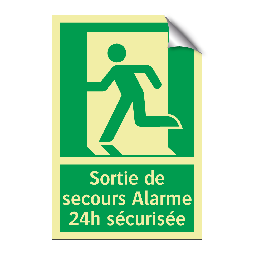 Panneau de secours avec le texte Sortie de secours Alarme 24h sécurisée et une symbolique claire