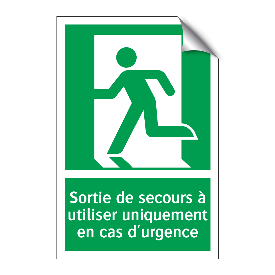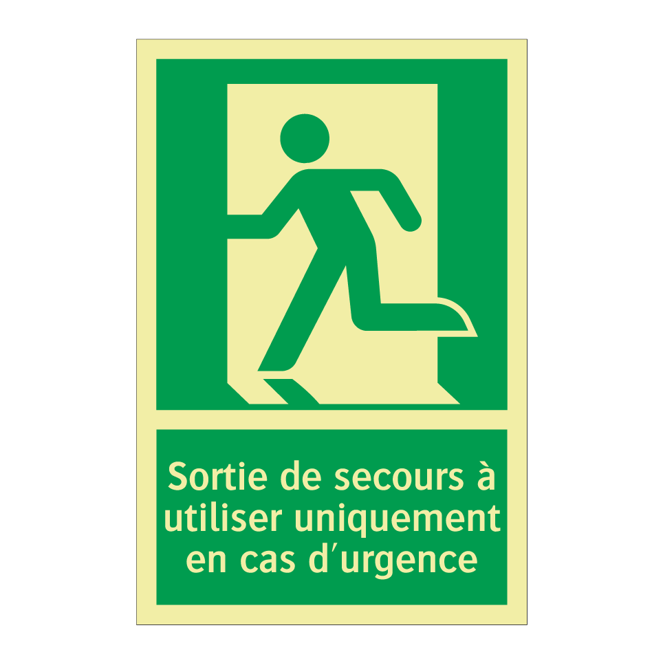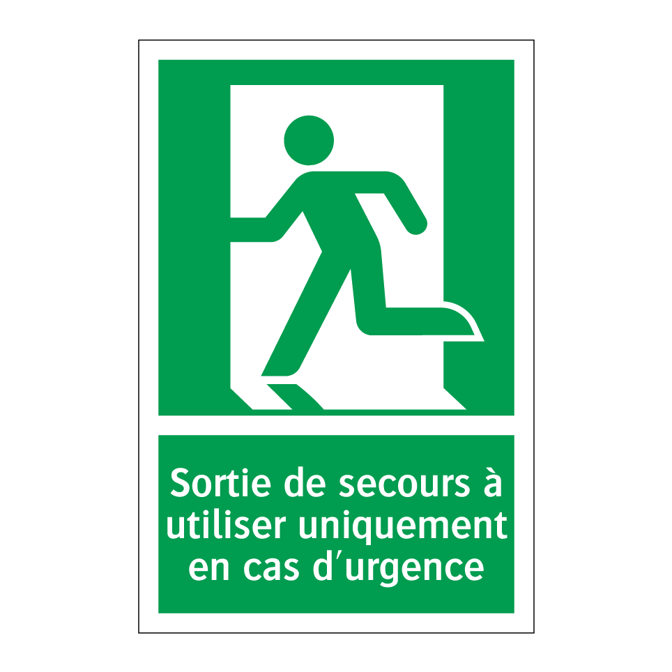 Panneau de secours avec le texte Sortie de secours à utiliser uniquement en cas d'urgence et une symbolique claire