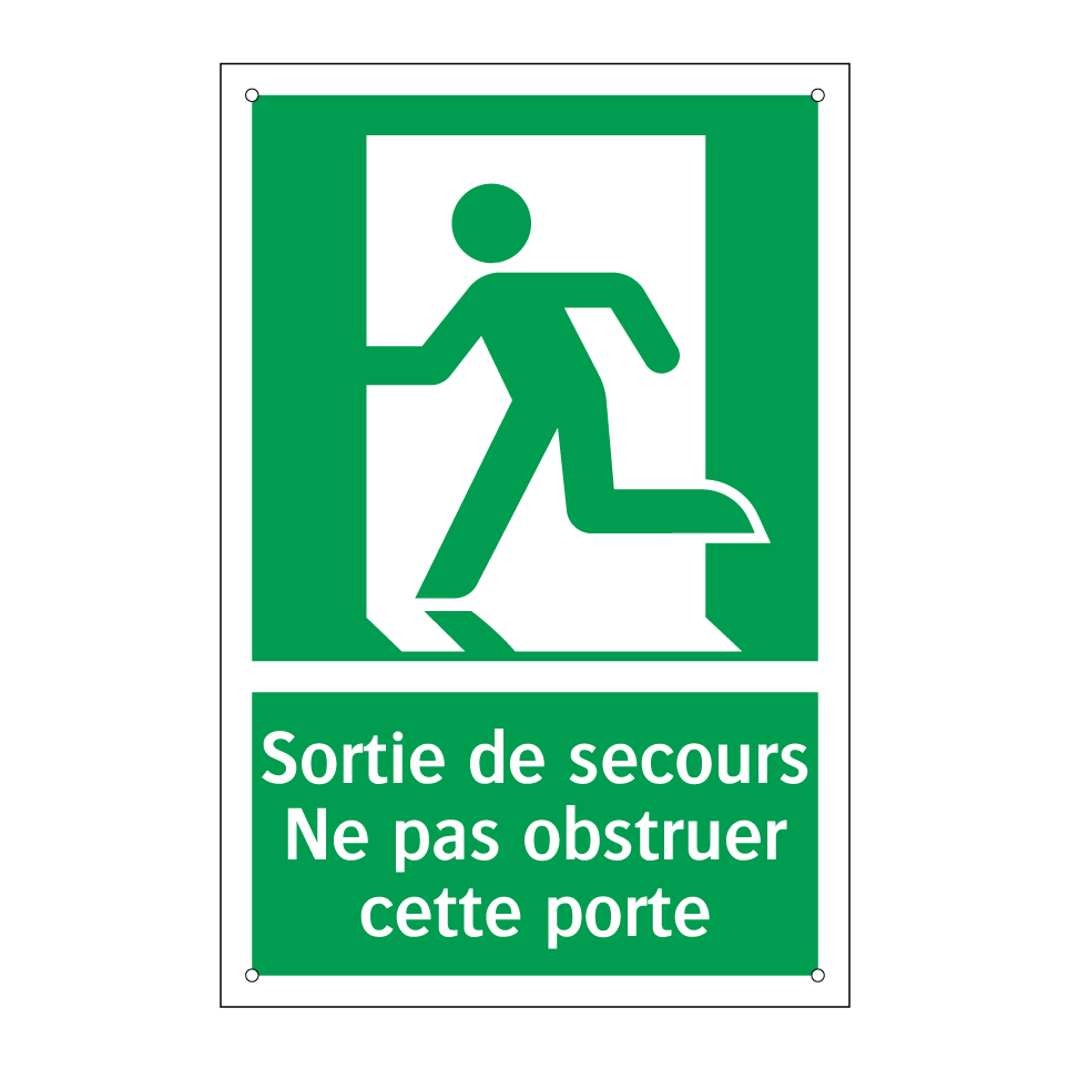 Panneau de secours avec le texte Sortie de secours Ne pas obstruer cette porte et une symbolique claire