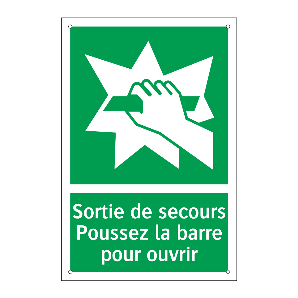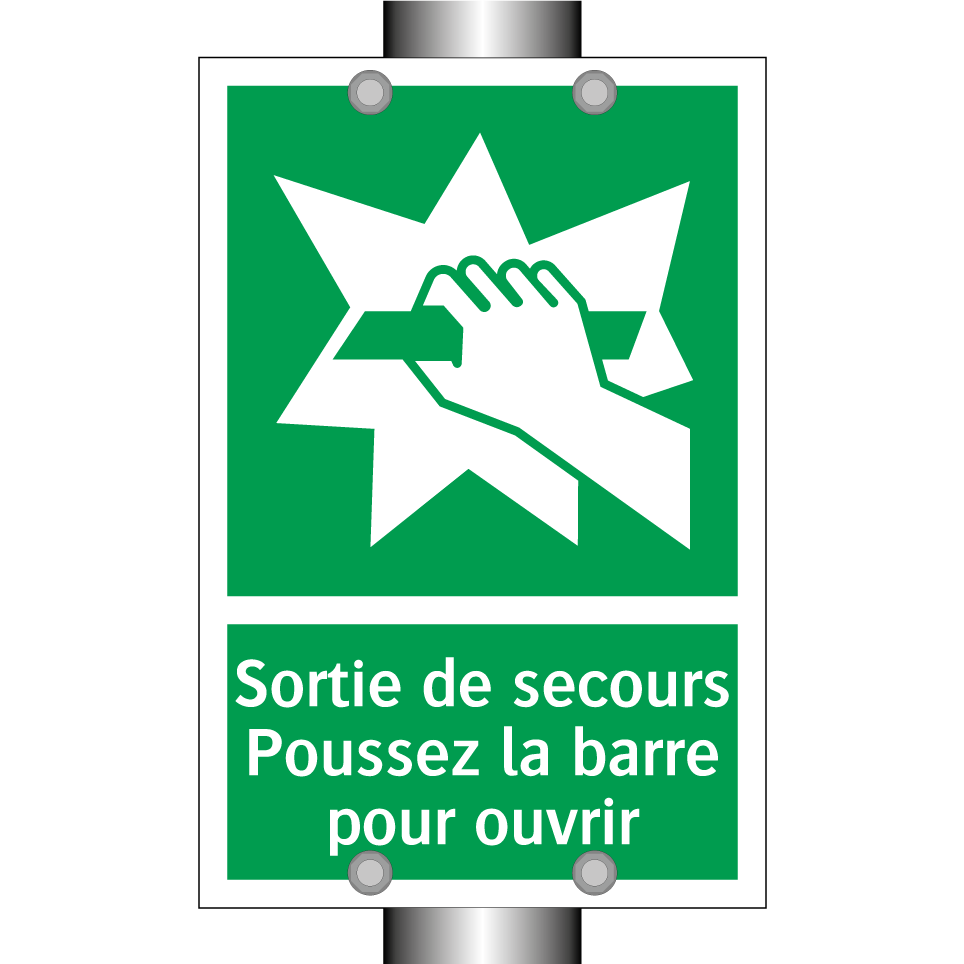 Panneau de secours avec le texte Sortie de secours Poussez la barre pour ouvrir et une symbolique claire