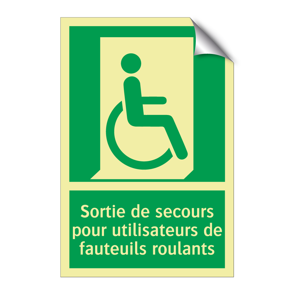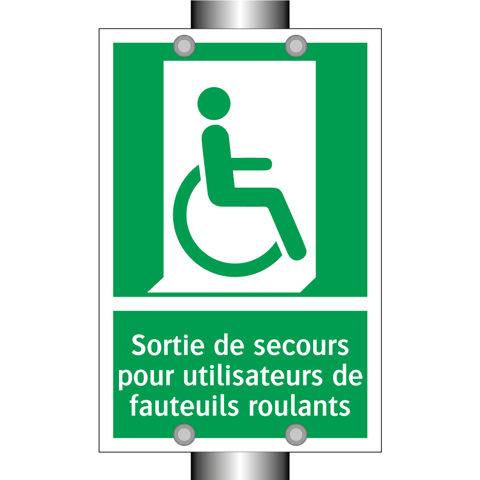 Panneau de secours avec le texte Sortie de secours pour utilisateurs de fauteuils roulants et une symbolique claire