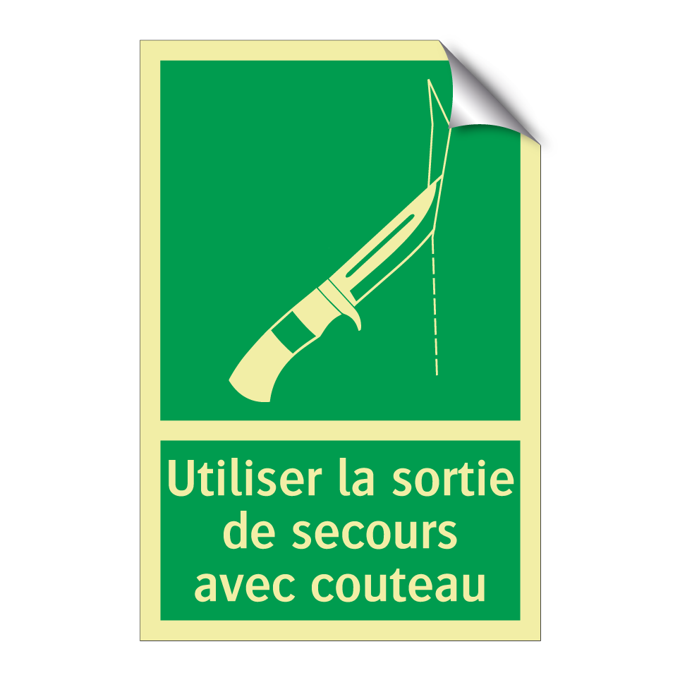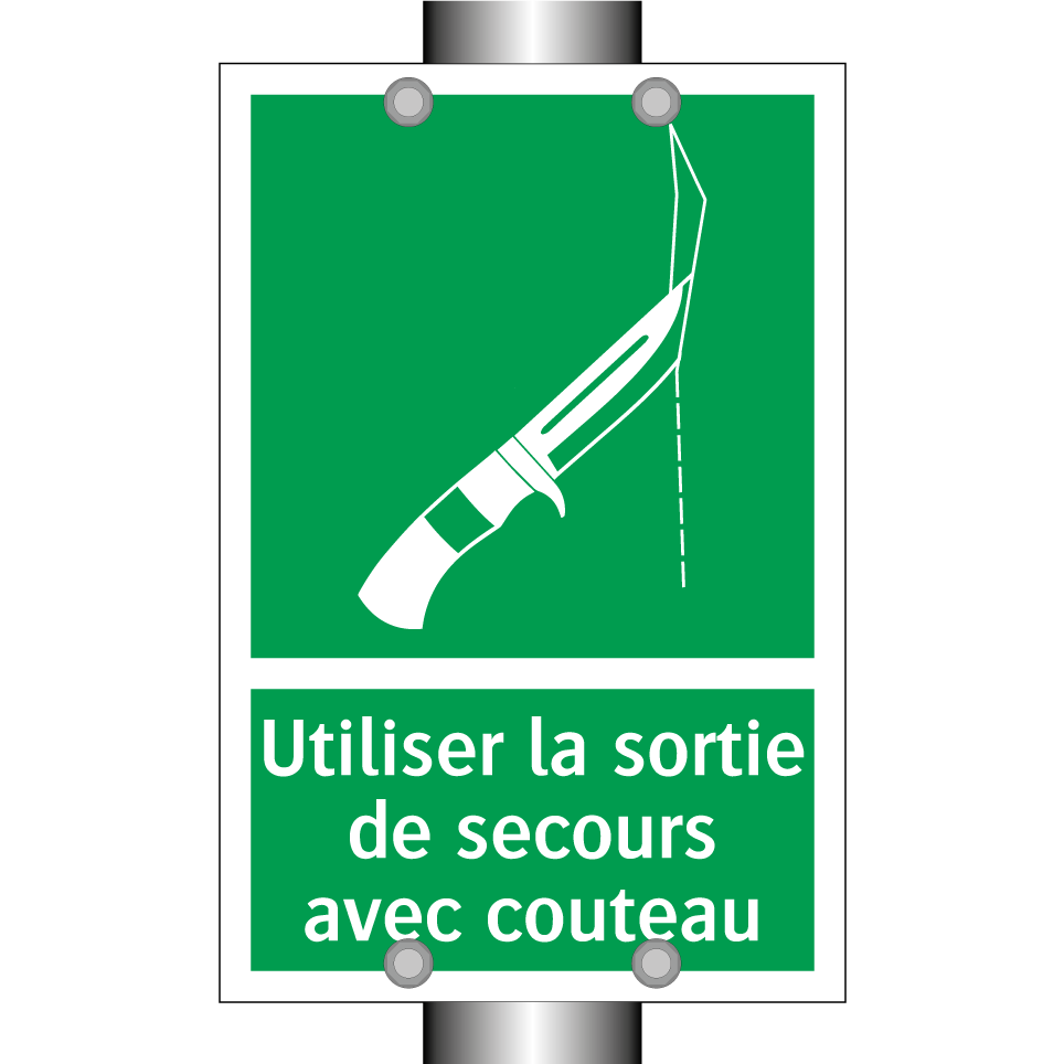 Panneau de secours avec le texte Utiliser la sortie de secours avec couteau et une symbolique claire
