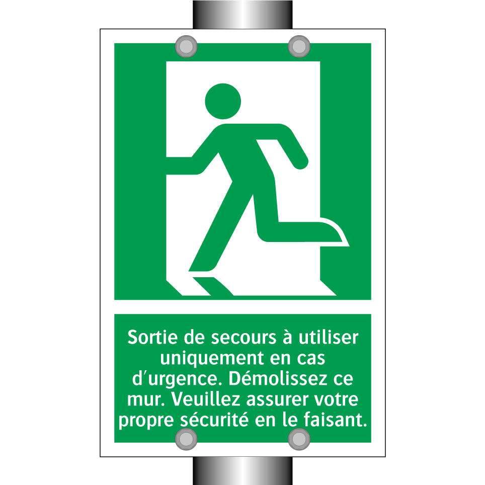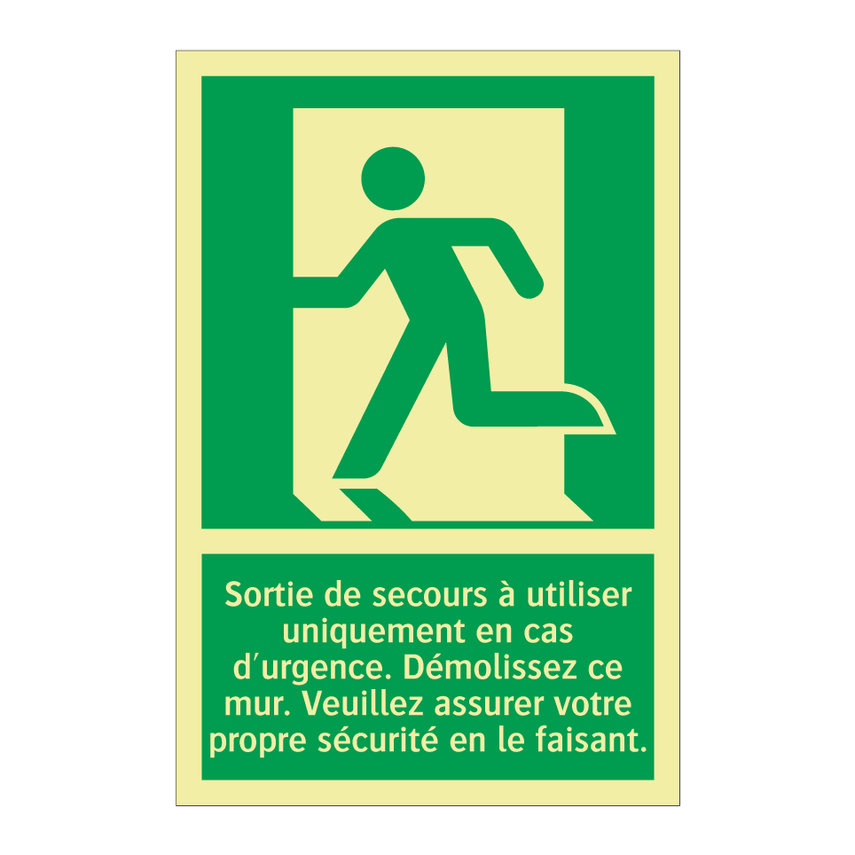 Panneau de secours avec le texte Sortie de secours à utiliser uniquement en cas d'urgence. Démolissez ce mur. Veuillez assurer votre propre sécurité en le faisant. et une symbolique claire