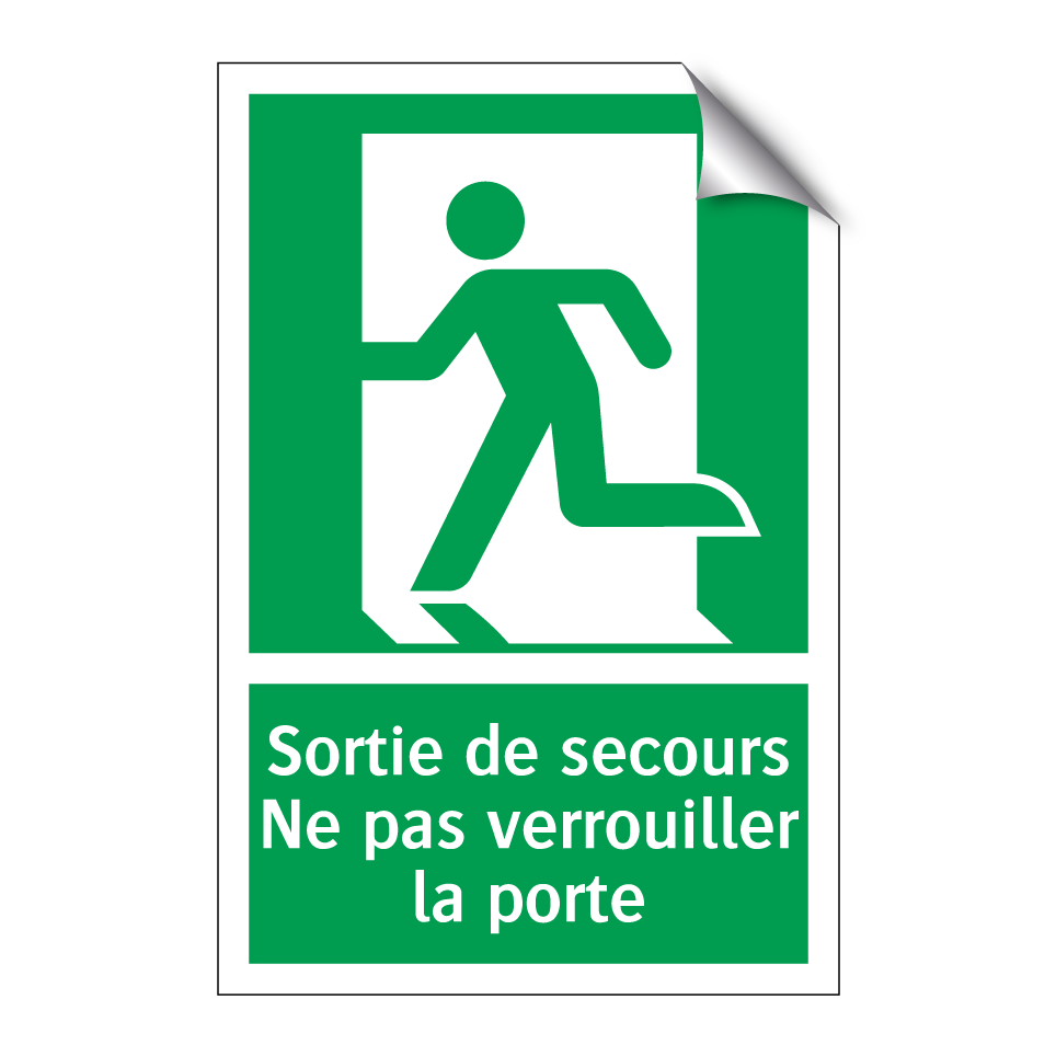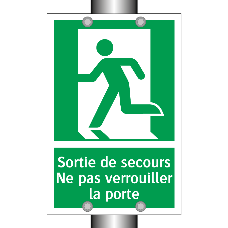 Panneau de secours avec le texte Sortie de secours Ne pas verrouiller la porte et une symbolique claire