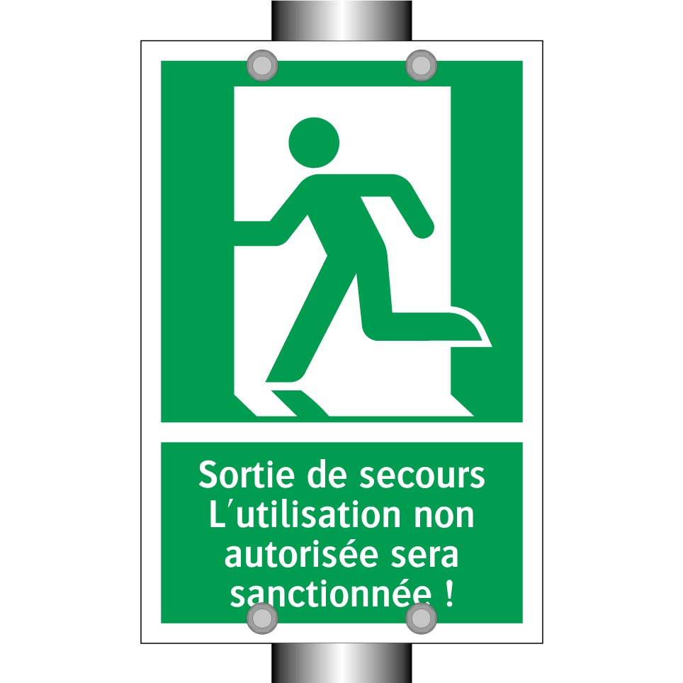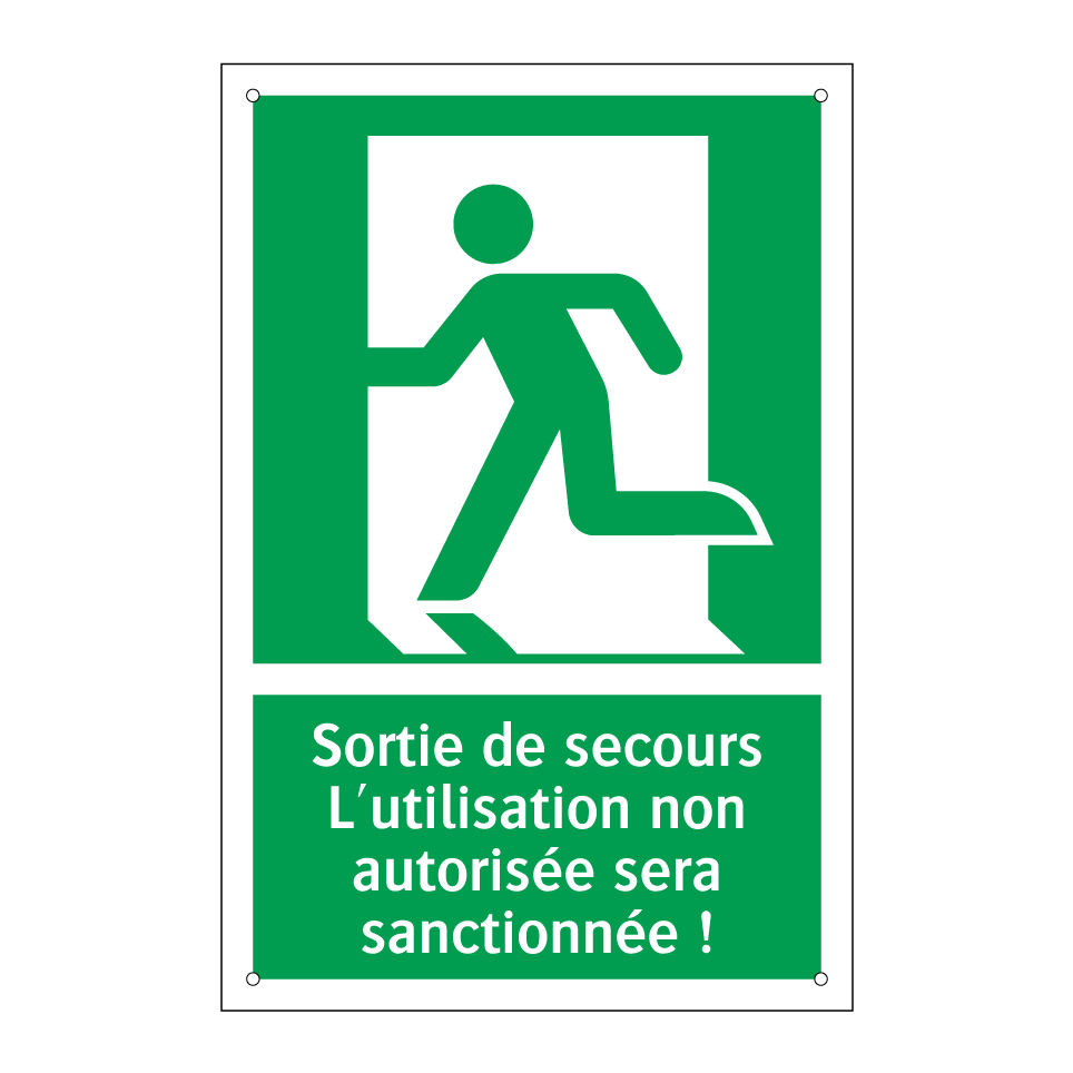 Panneau de secours avec le texte Sortie de secours L'utilisation non autorisée sera sanctionnée ! et une symbolique claire