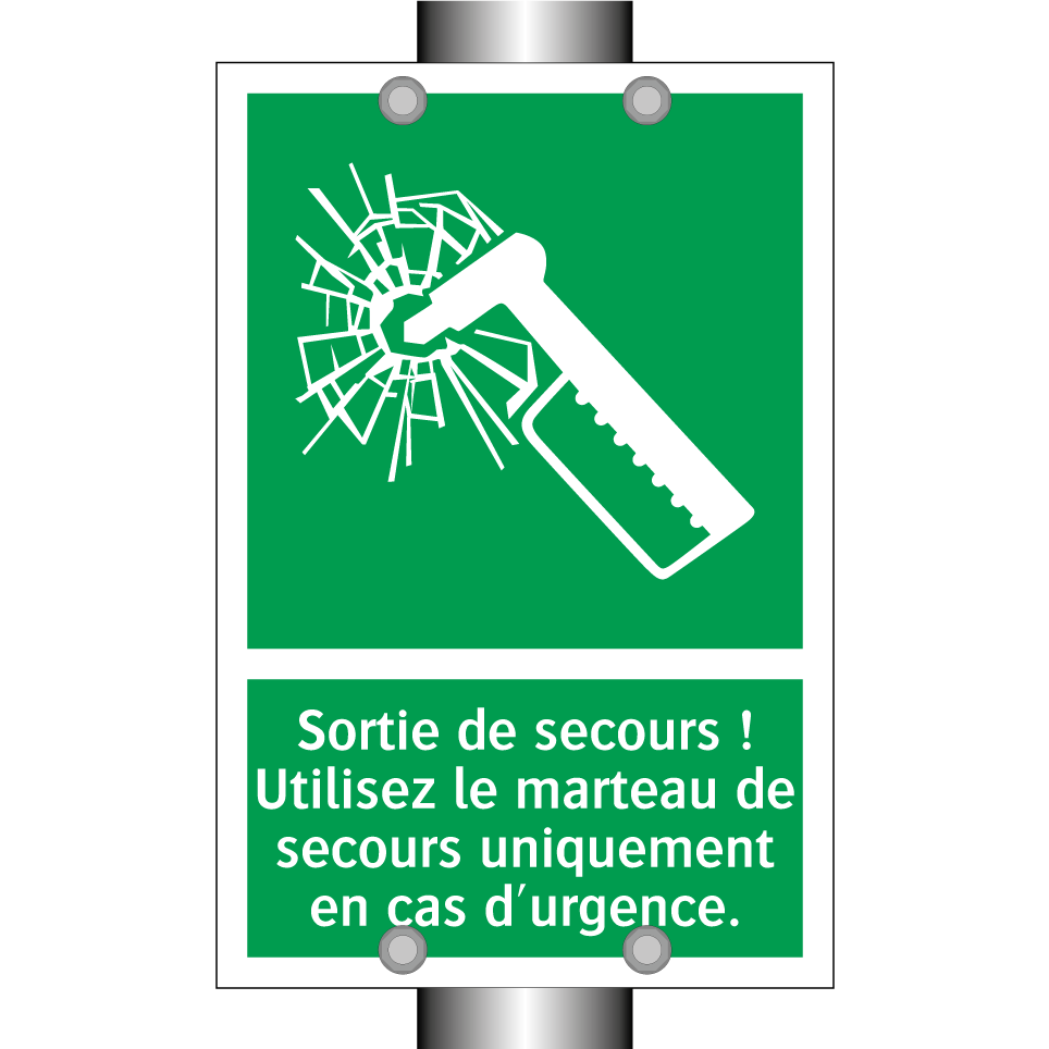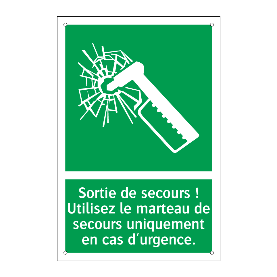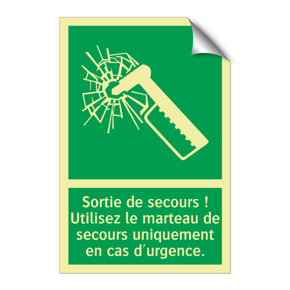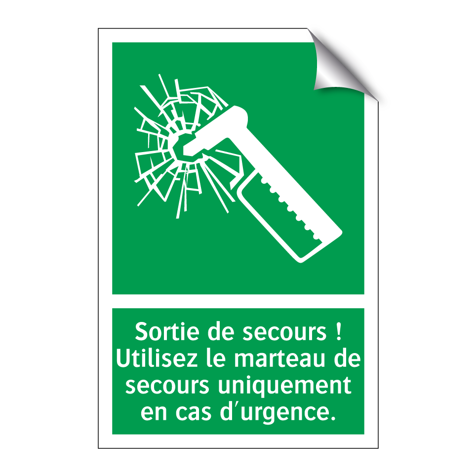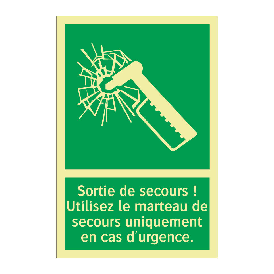 Panneau de secours avec le texte Sortie de secours ! Utilisez le marteau de secours uniquement en cas d'urgence. et une symbolique claire