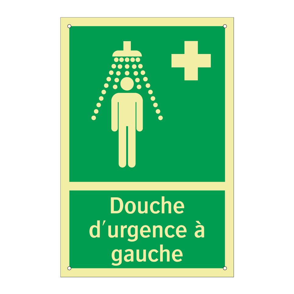 Panneau de secours avec le texte Douche d'urgence à gauche et une symbolique claire