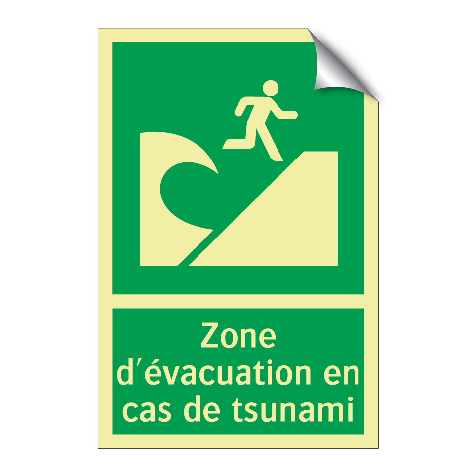 Panneau de secours avec le texte Zone d'évacuation en cas de tsunami et une symbolique claire