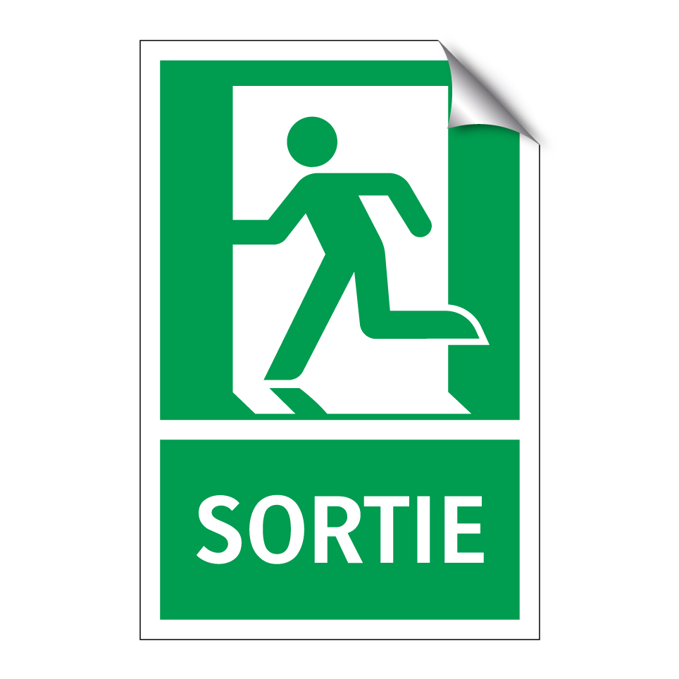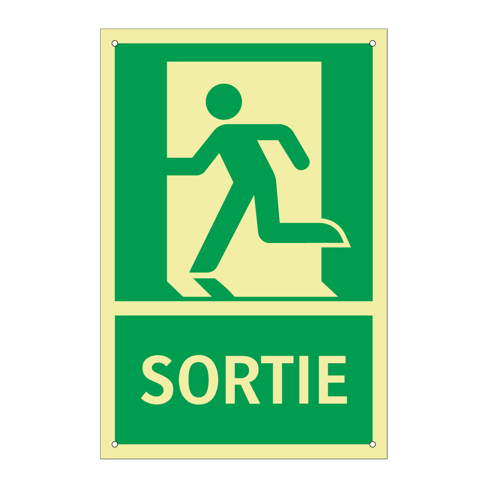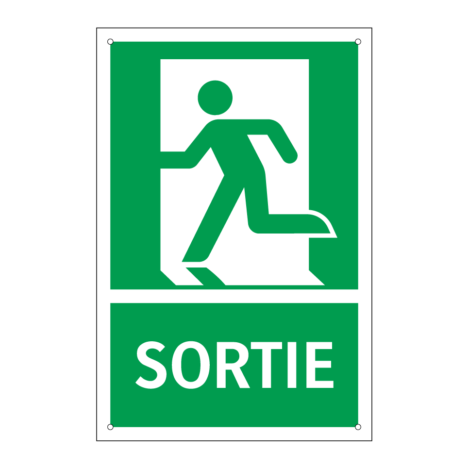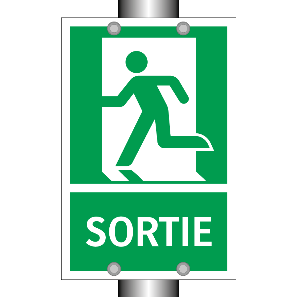 Panneau de secours avec le texte SORTIE et une symbolique claire