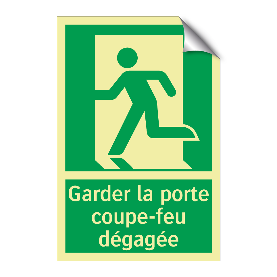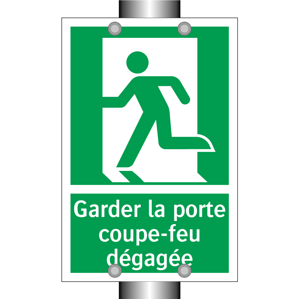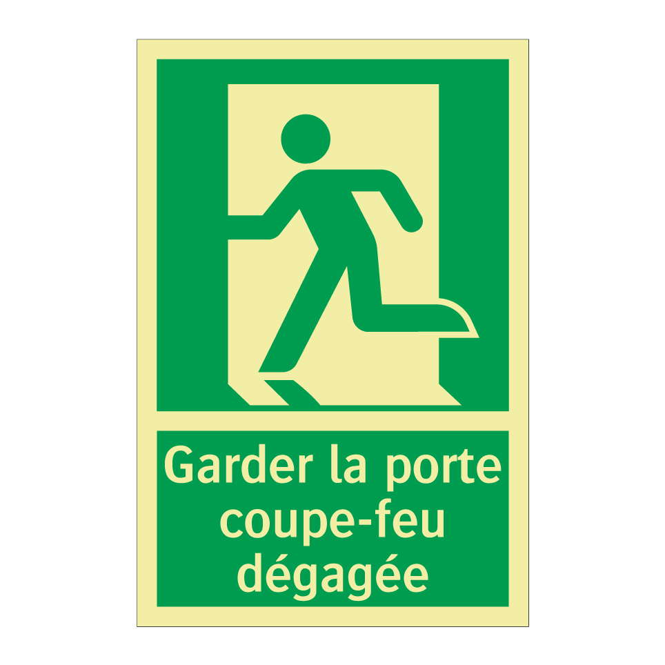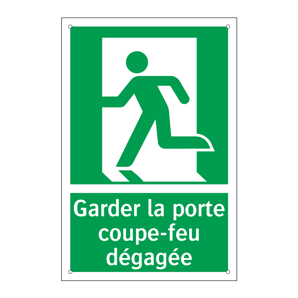 Panneau de secours avec le texte Garder la porte coupe-feu dégagée et une symbolique claire