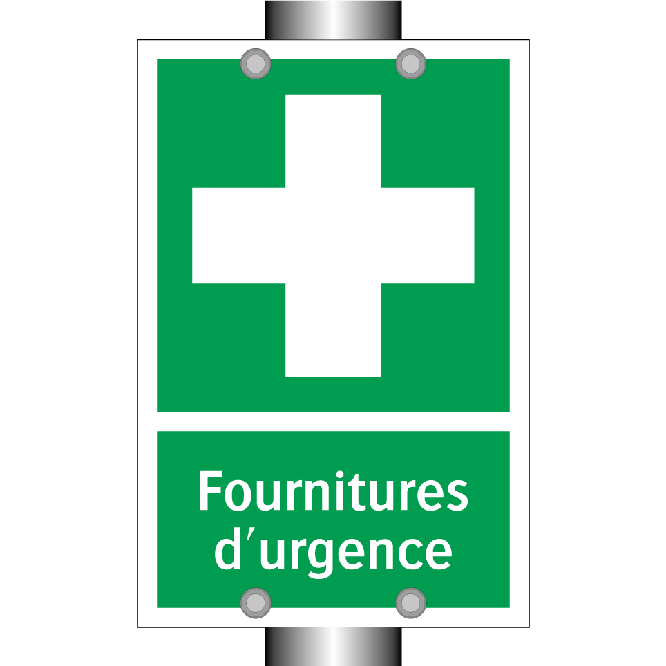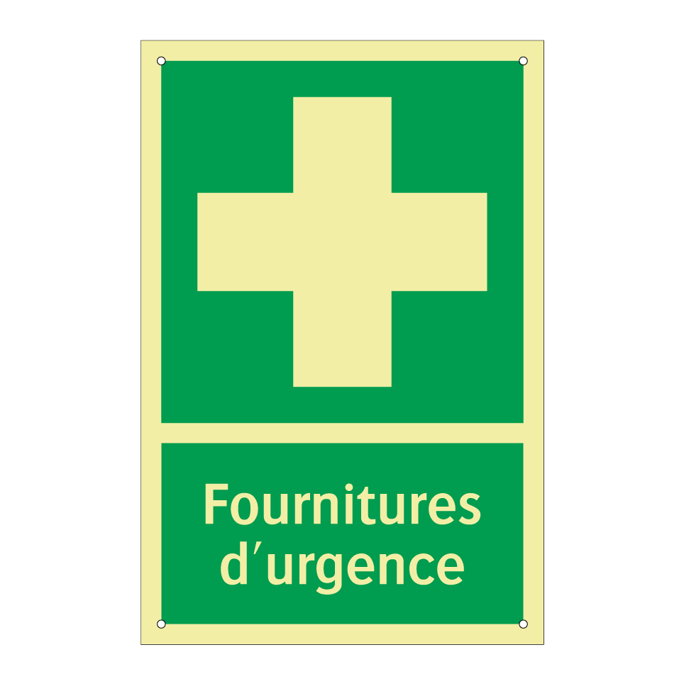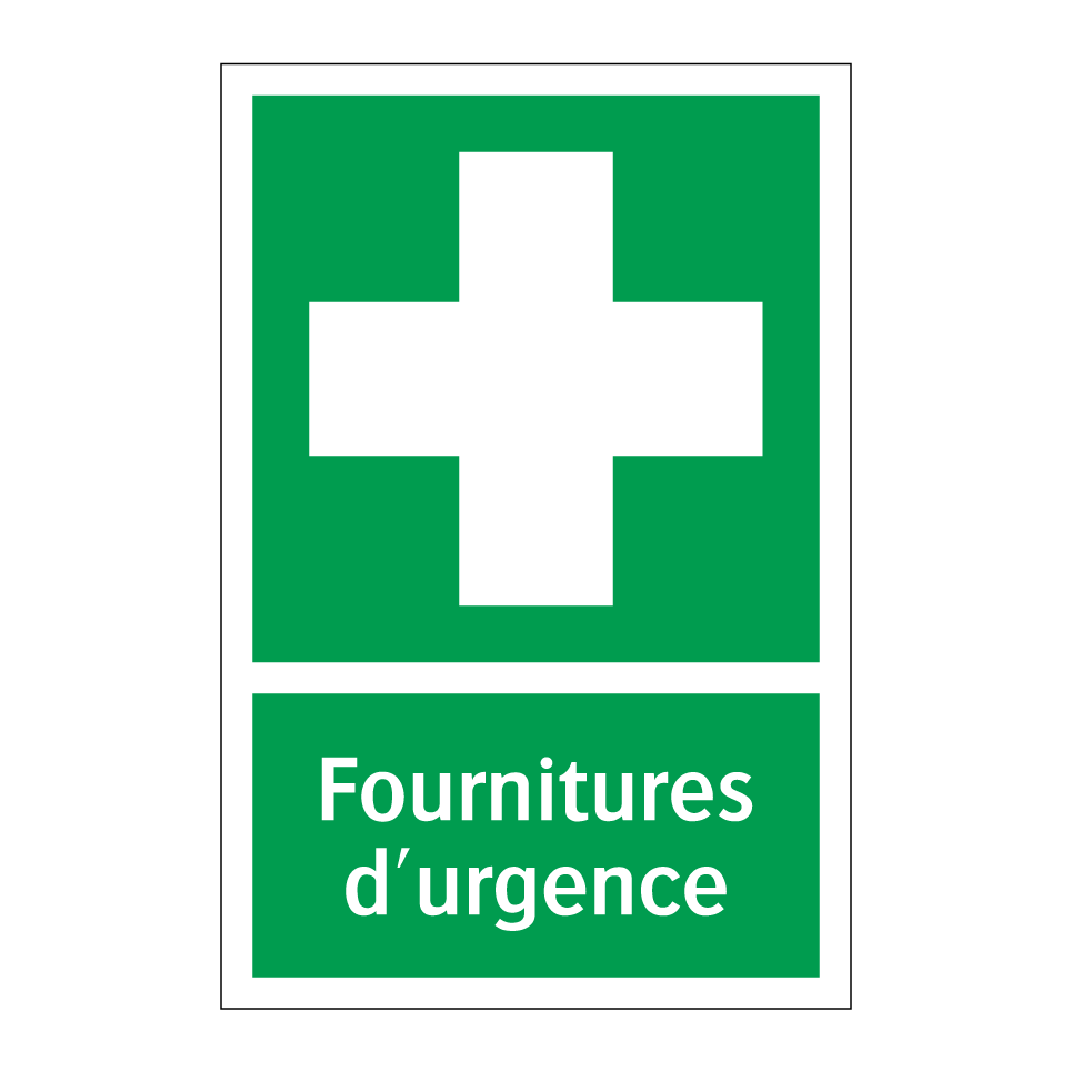 Panneau de secours avec le texte Fournitures d'urgence et une symbolique claire
