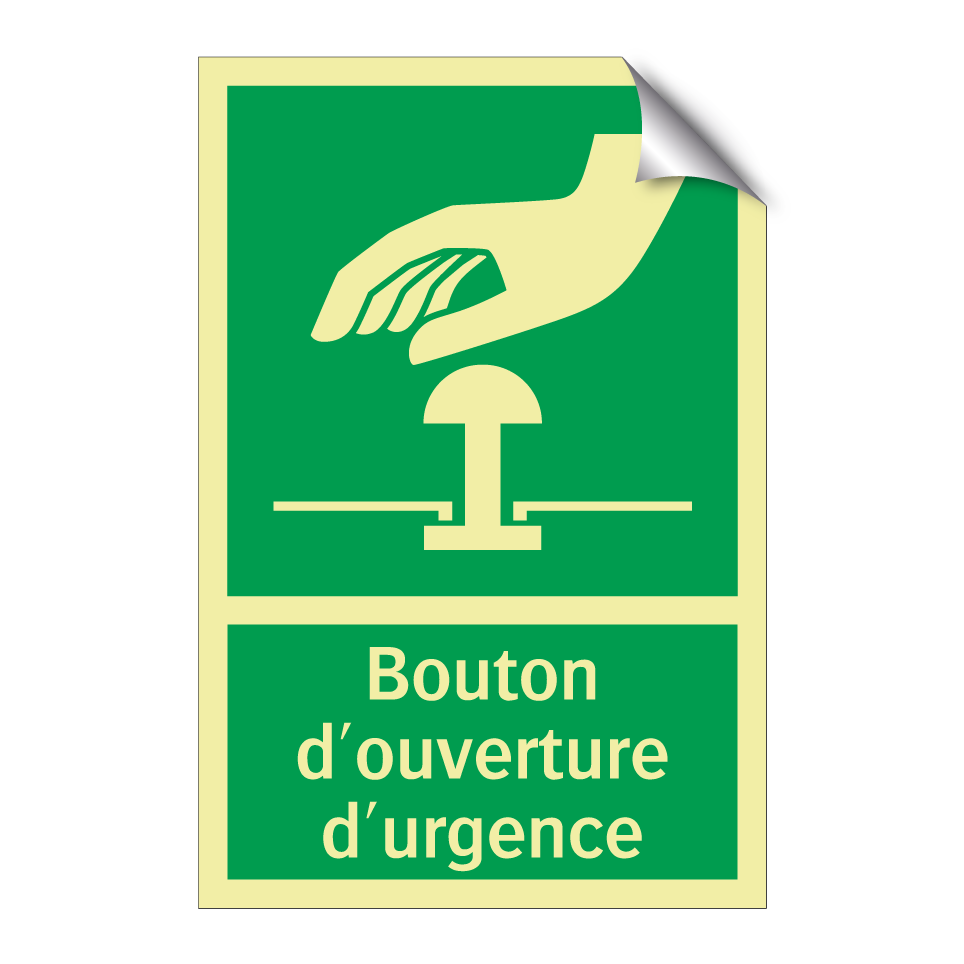 Panneau de secours avec le texte Bouton d'ouverture d'urgence et une symbolique claire