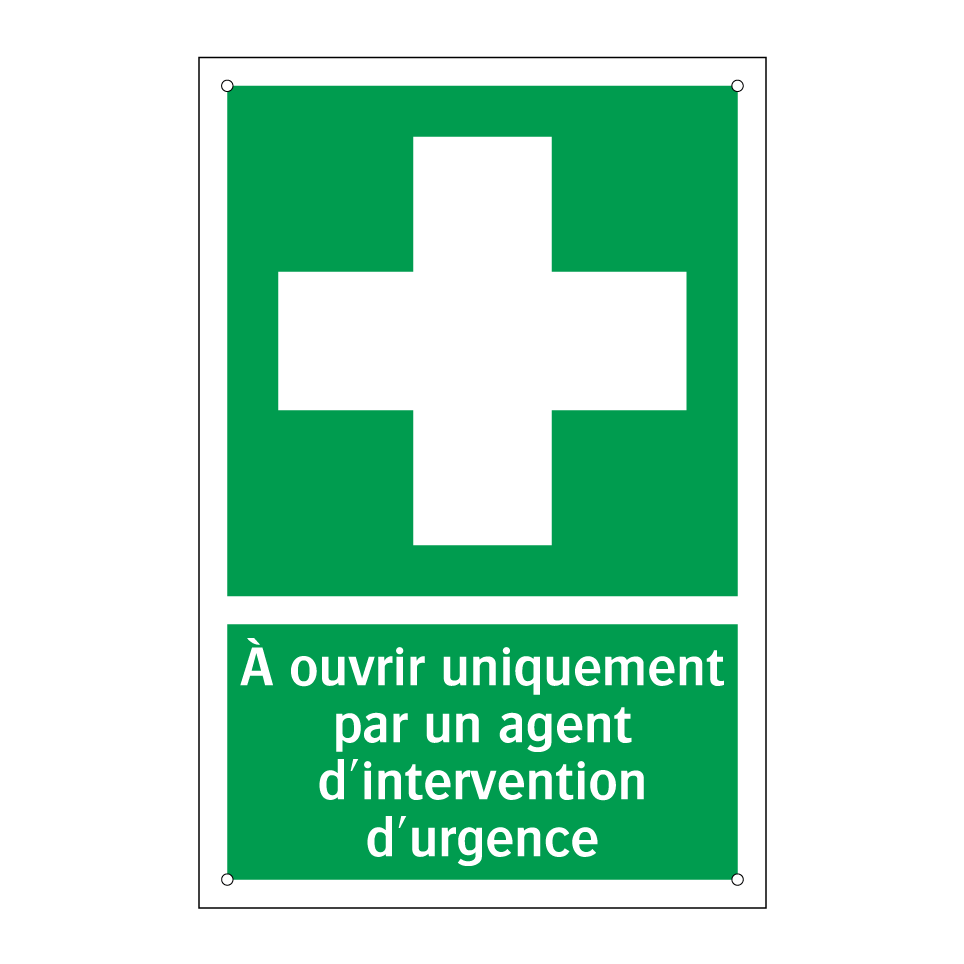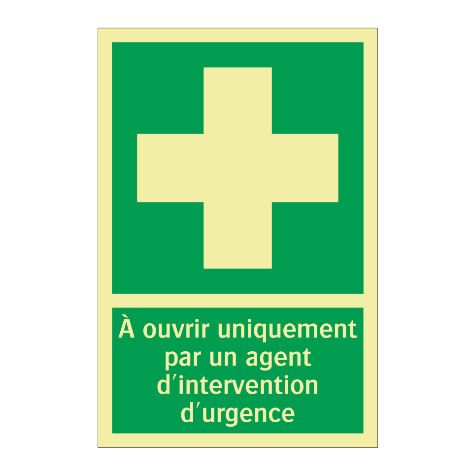 Panneau de secours avec le texte À ouvrir uniquement par un agent d'intervention d'urgence et une symbolique claire
