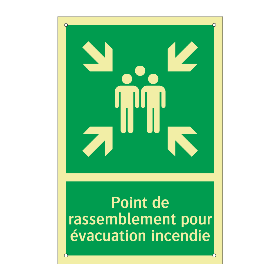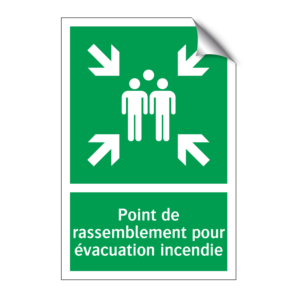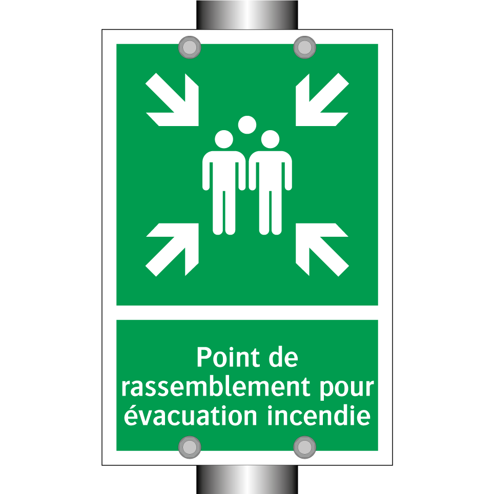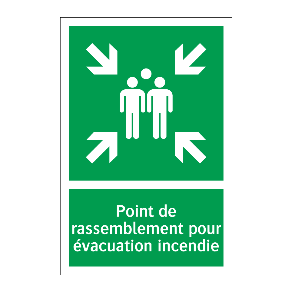 Panneau de secours avec le texte Point de rassemblement pour évacuation incendie et une symbolique claire