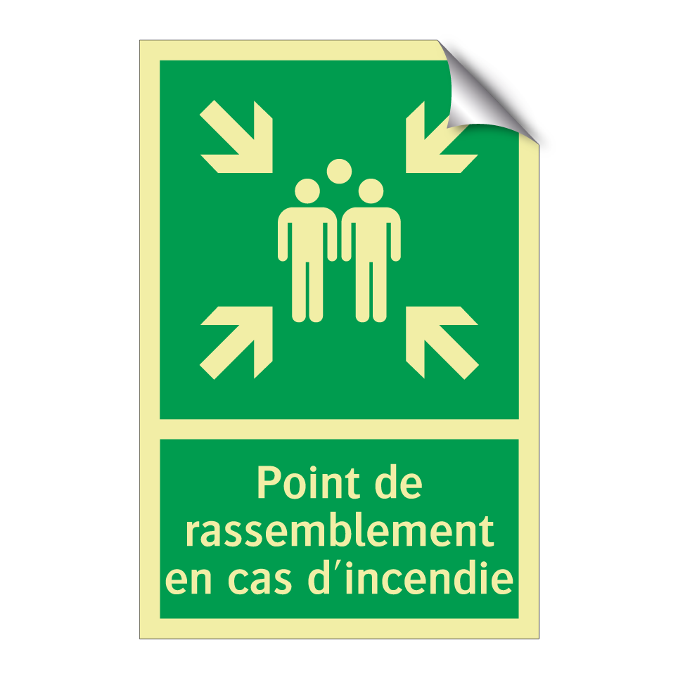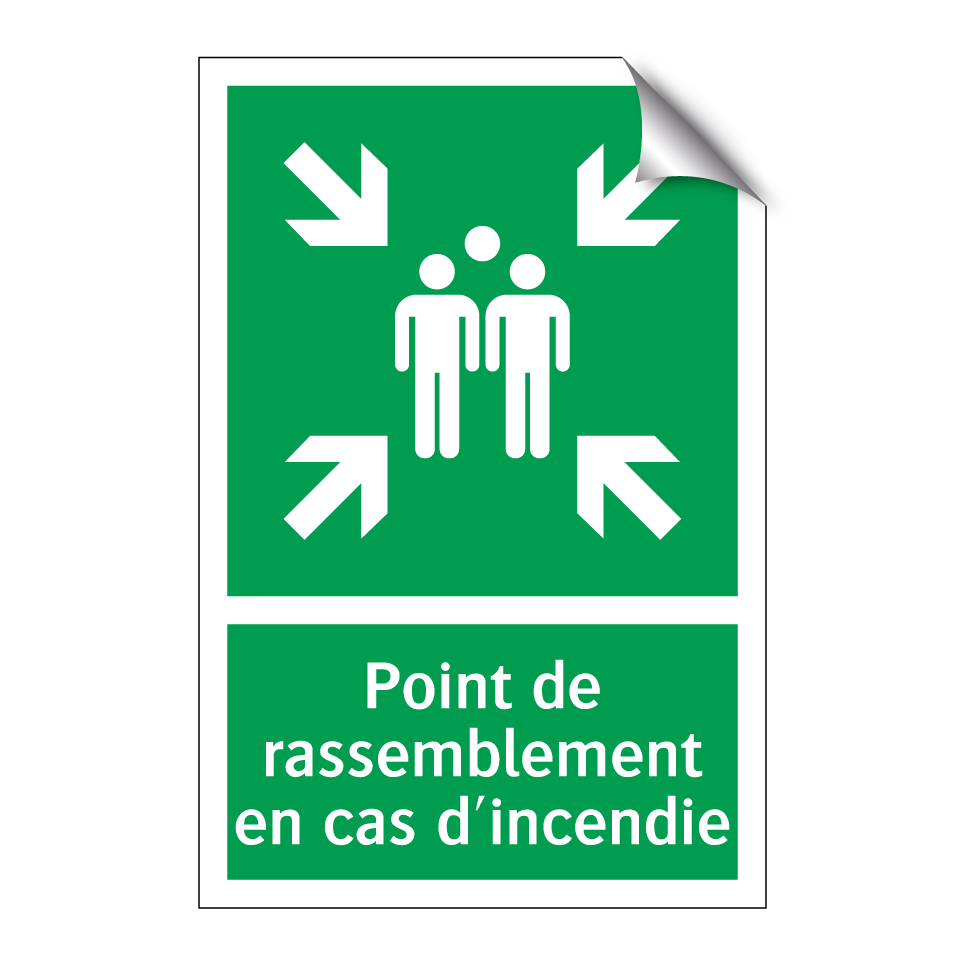 Panneau de secours avec le texte Point de rassemblement en cas d'incendie et une symbolique claire