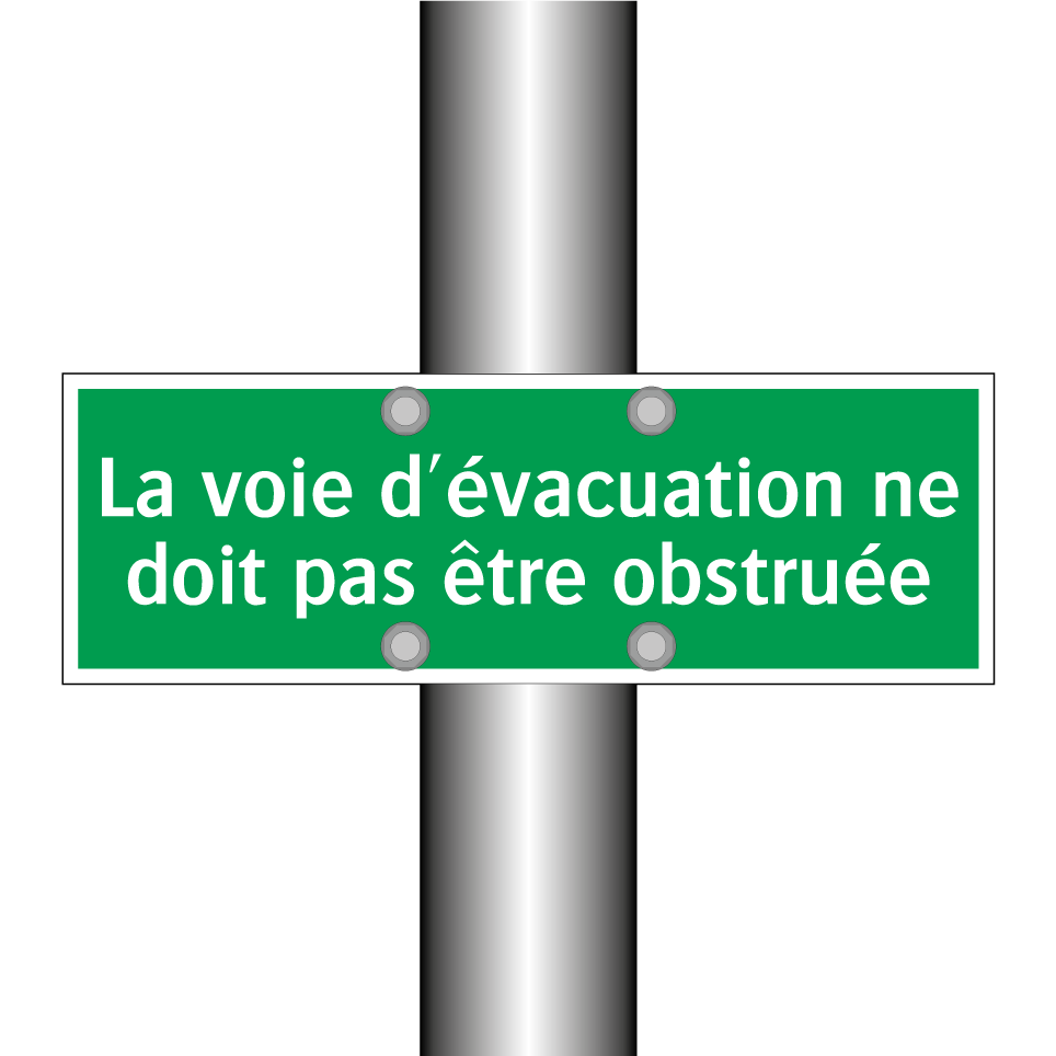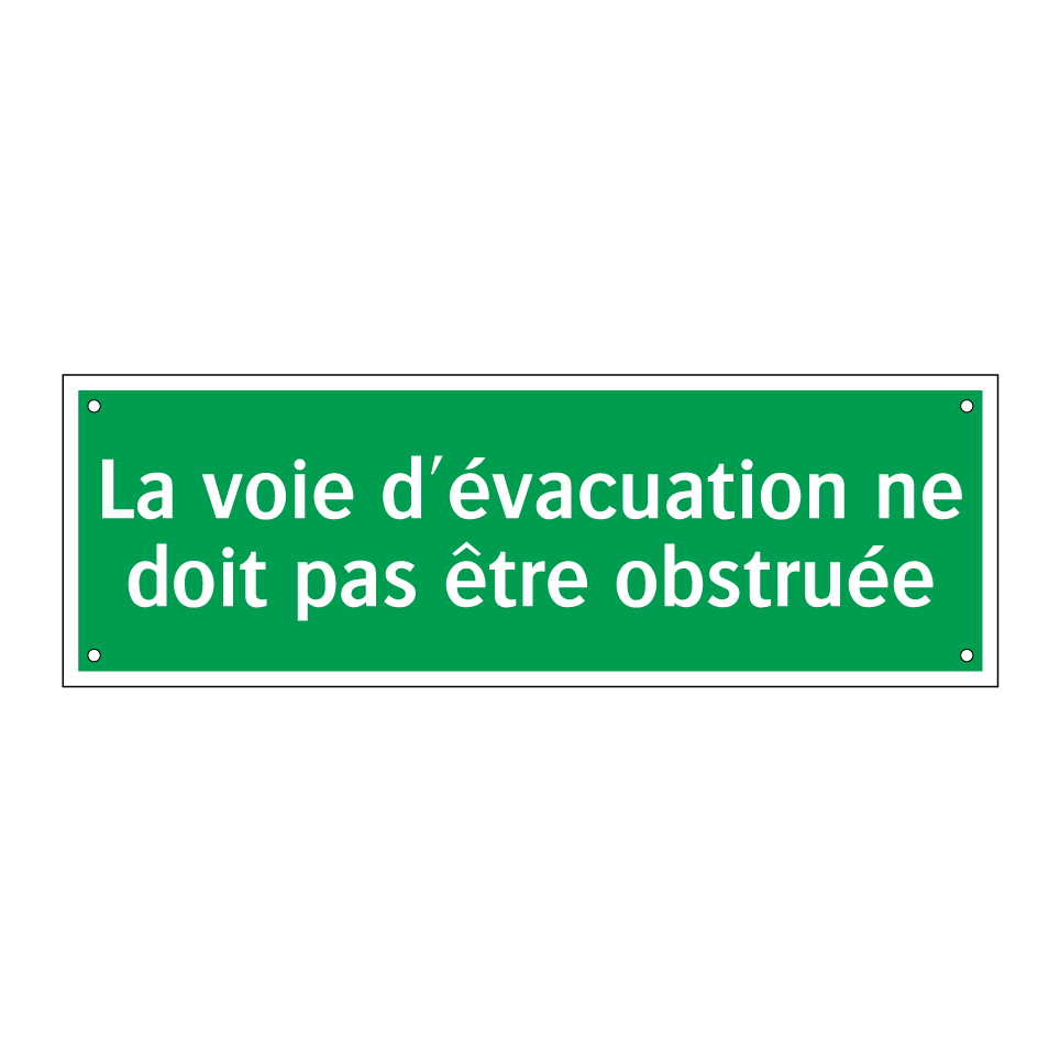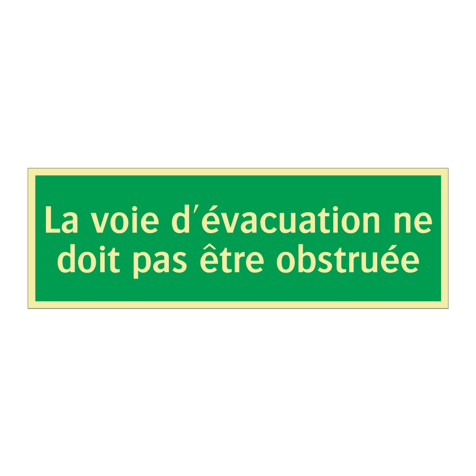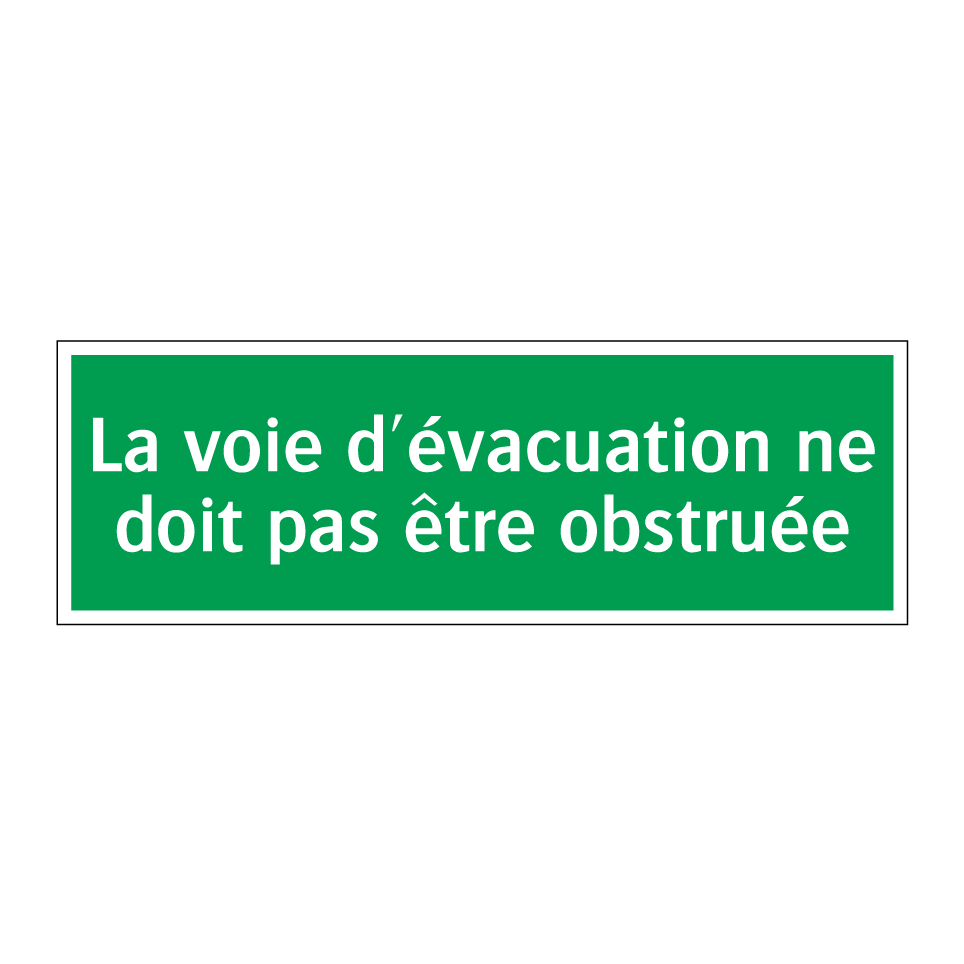 Panneau de secours avec le texte La voie d'évacuation ne doit pas être obstruée