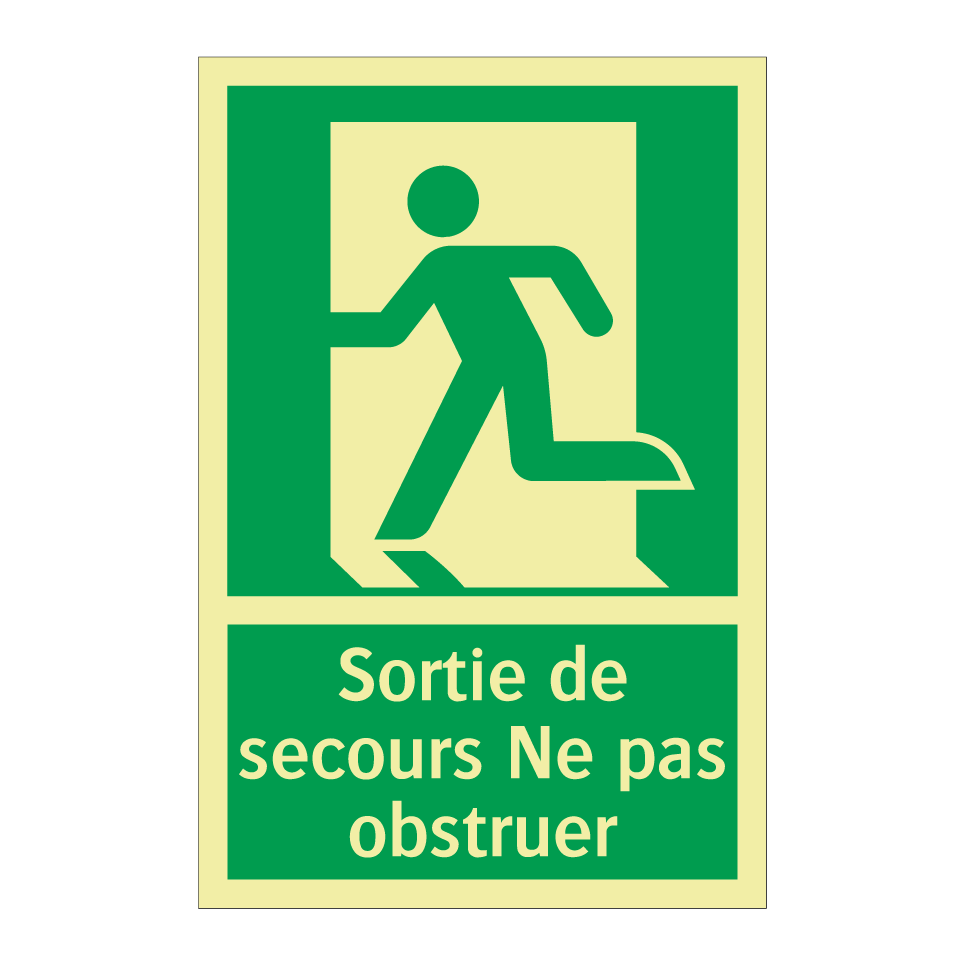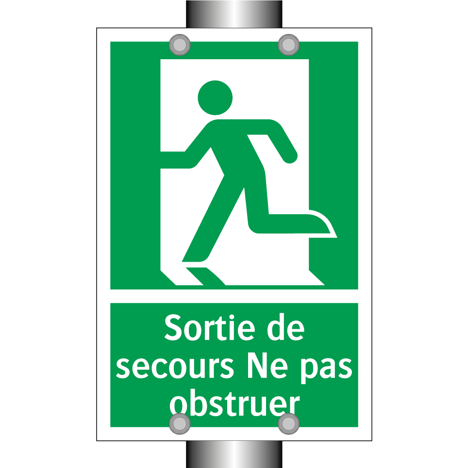 Panneau de secours avec le texte Sortie de secours Ne pas obstruer et une symbolique claire