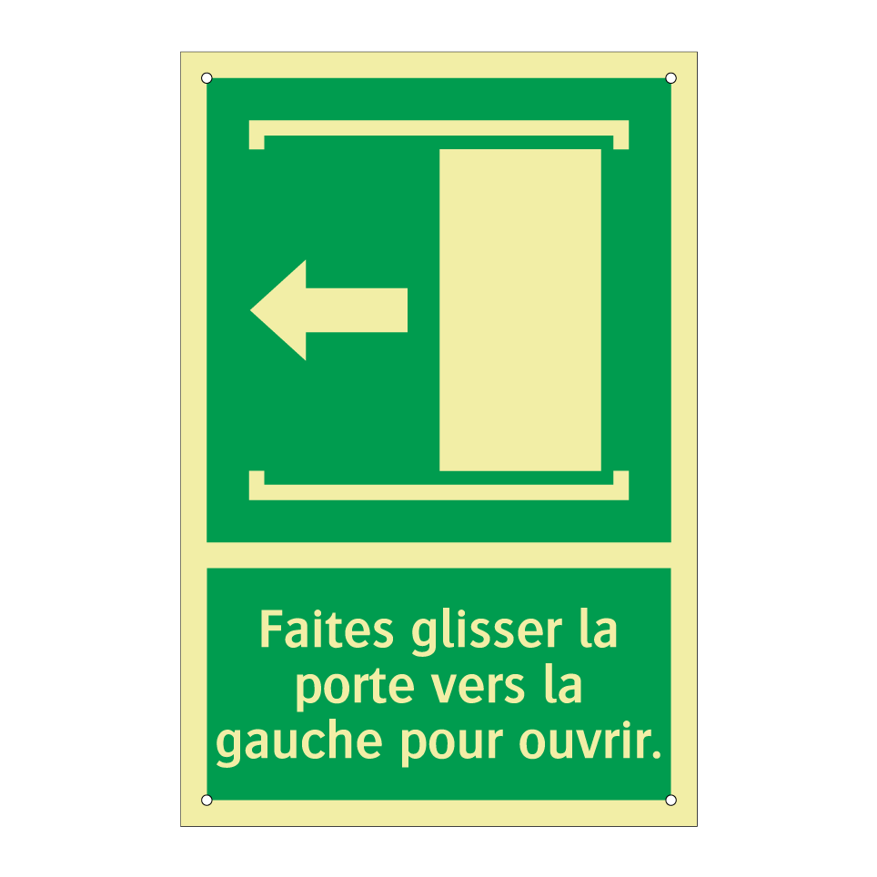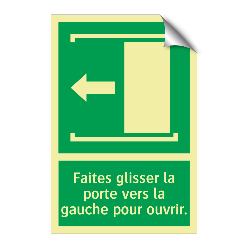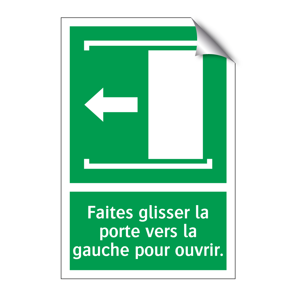 Panneau de secours avec le texte Faites glisser la porte vers la gauche pour ouvrir. et une symbolique claire