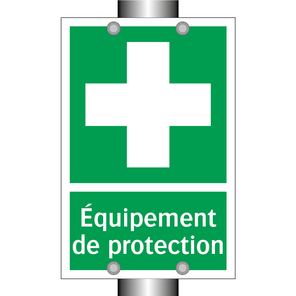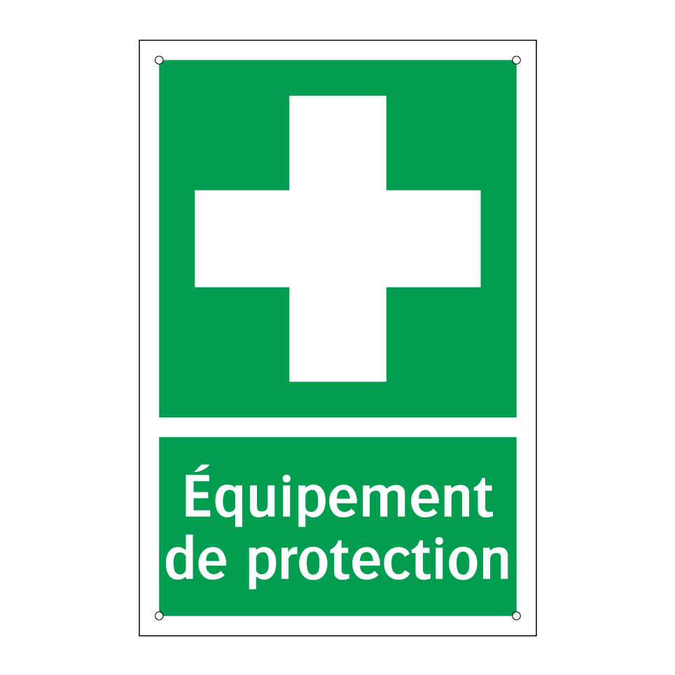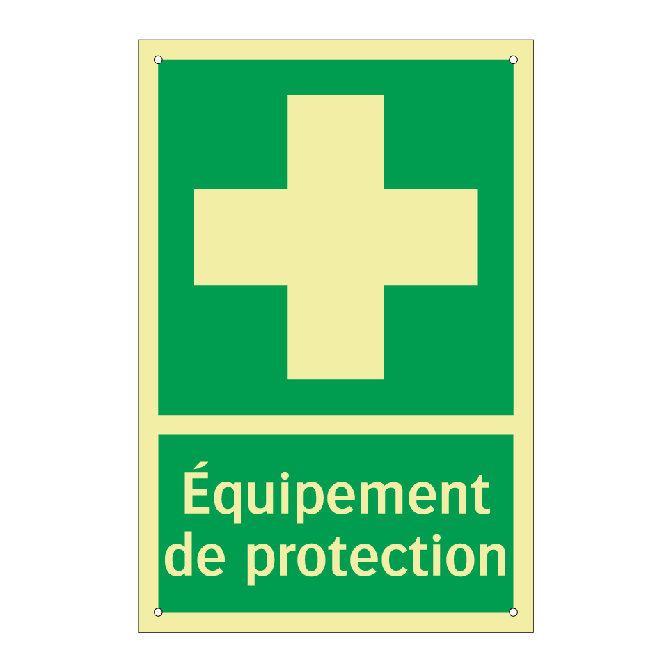 Panneau de secours avec le texte Équipement de protection et une symbolique claire