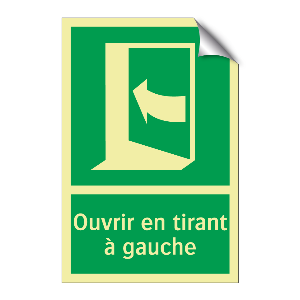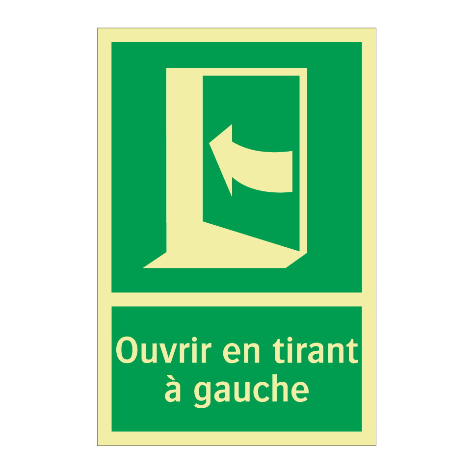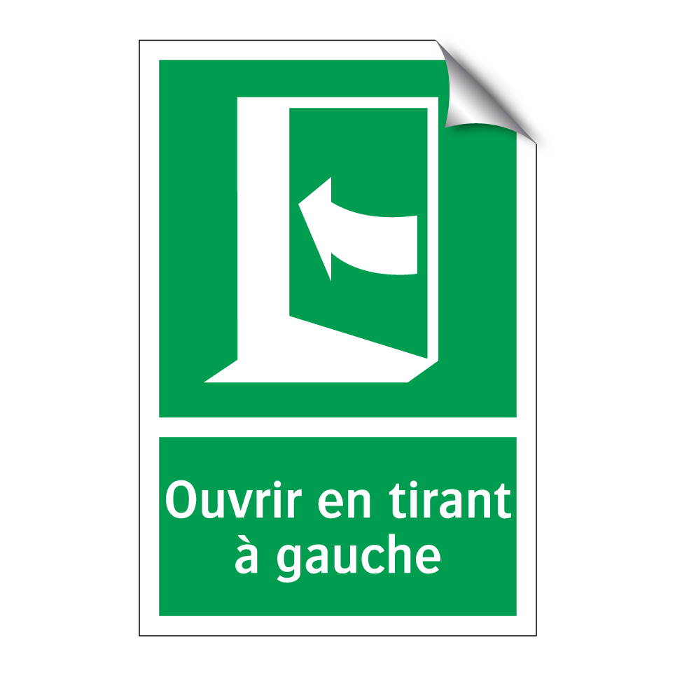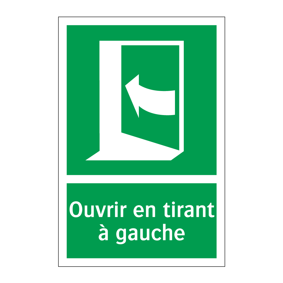 Panneau de secours avec le texte Ouvrir en tirant à gauche et une symbolique claire