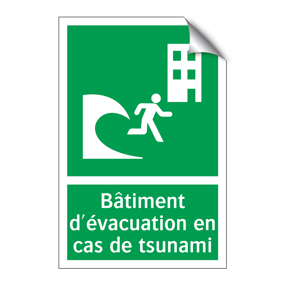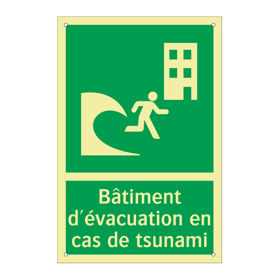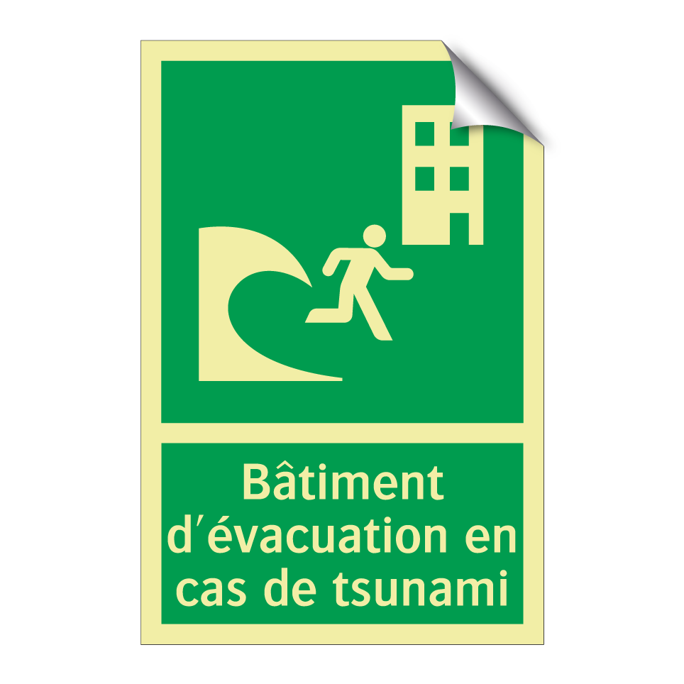Panneau de secours avec le texte Bâtiment d'évacuation en cas de tsunami et une symbolique claire