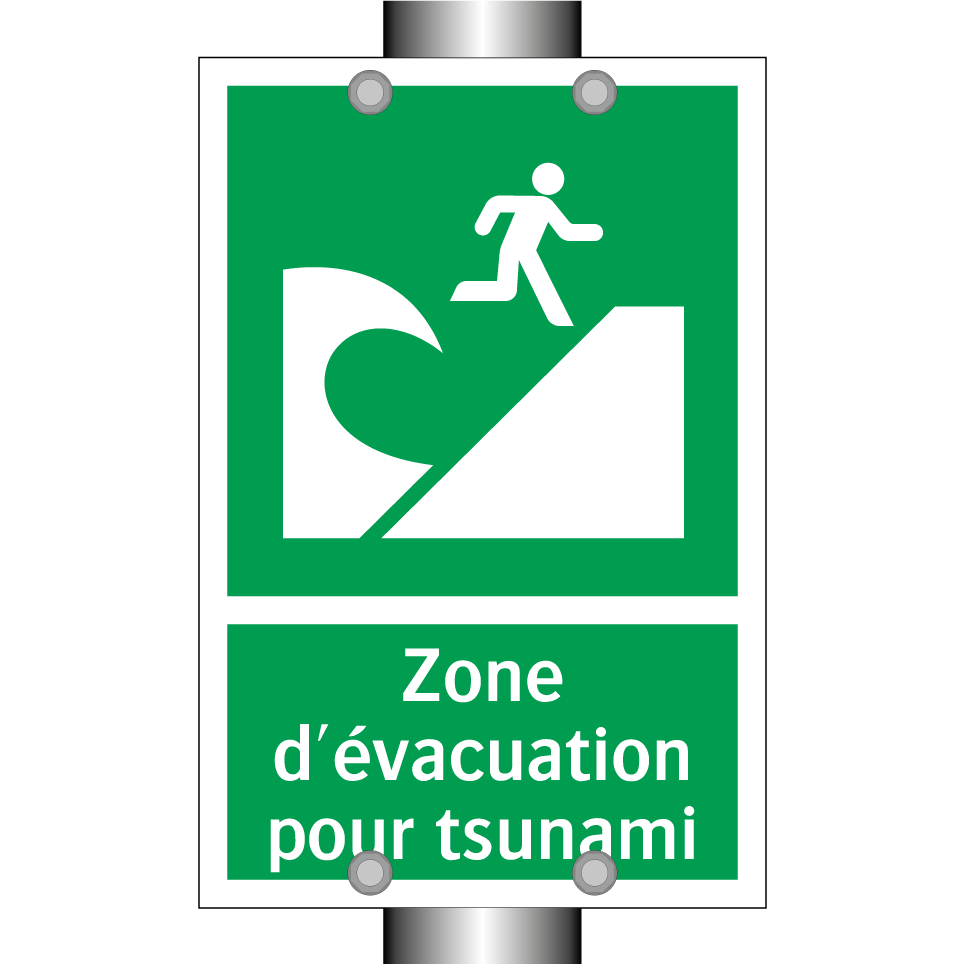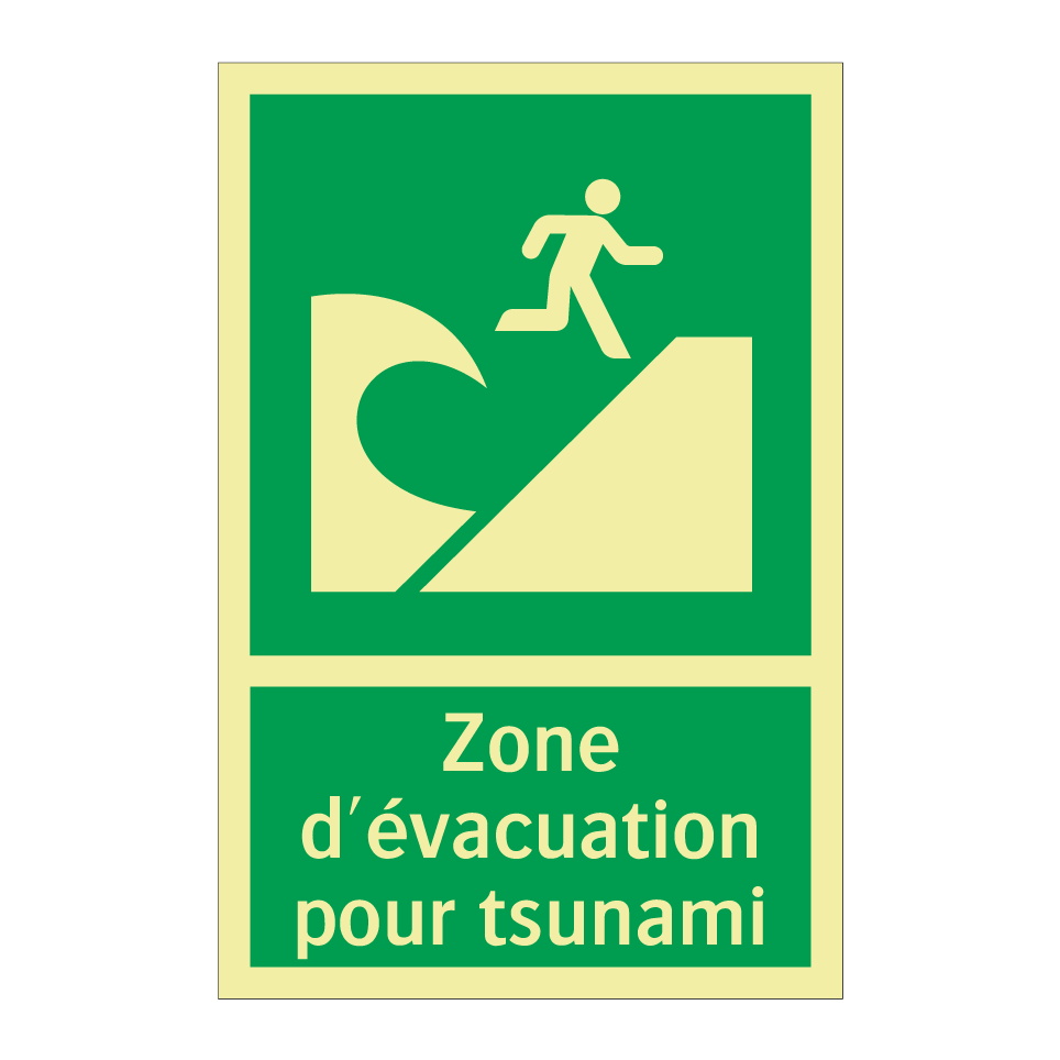 Panneau de secours avec le texte Zone d'évacuation pour tsunami et une symbolique claire