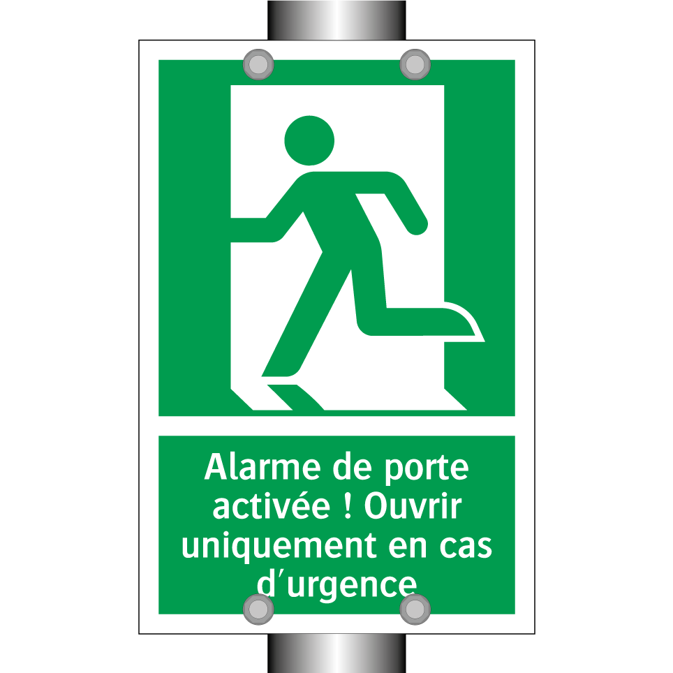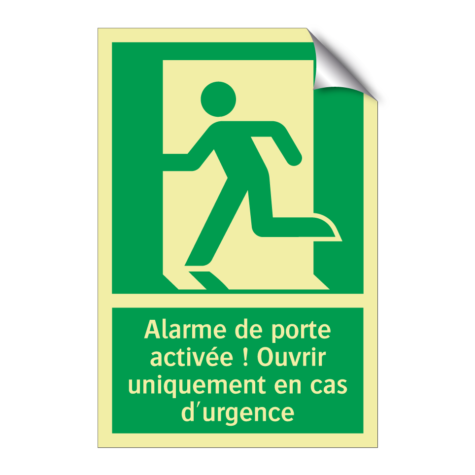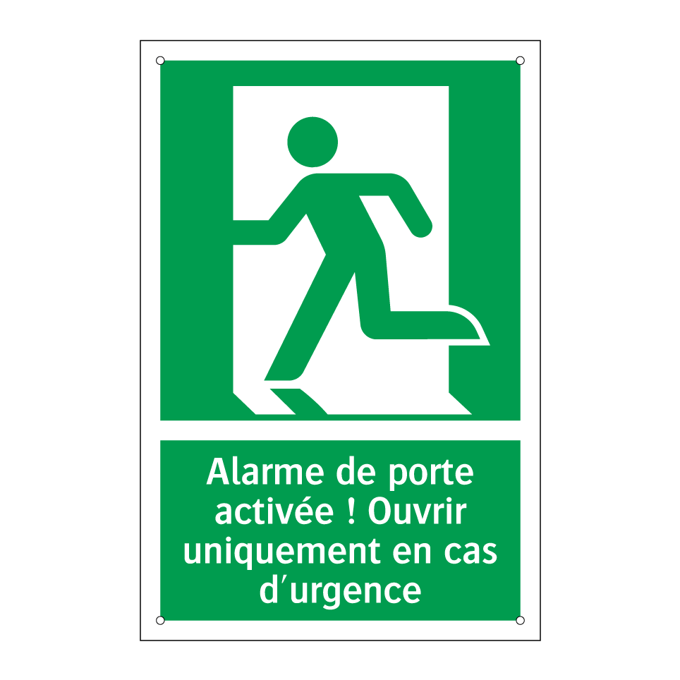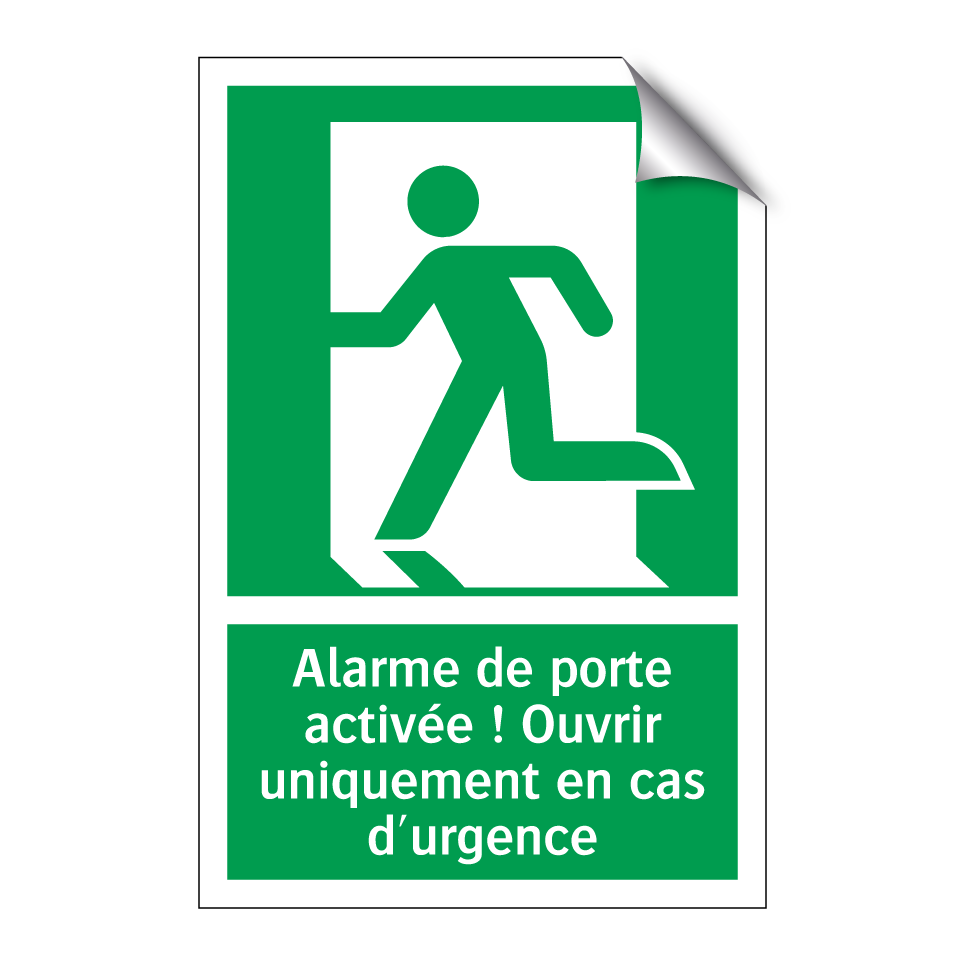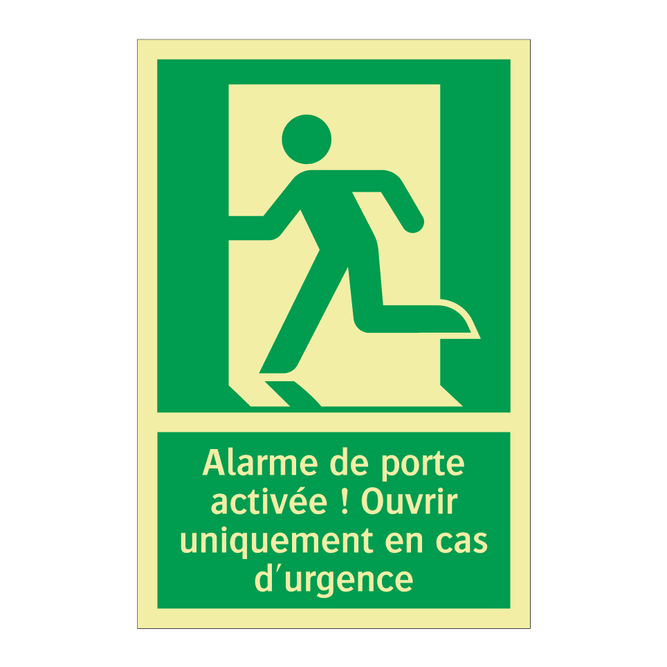 Panneau de secours avec le texte Alarme de porte activée ! Ouvrir uniquement en cas d'urgence et une symbolique claire