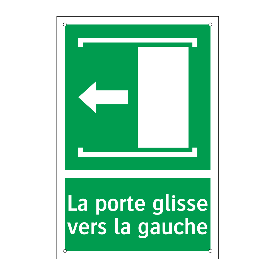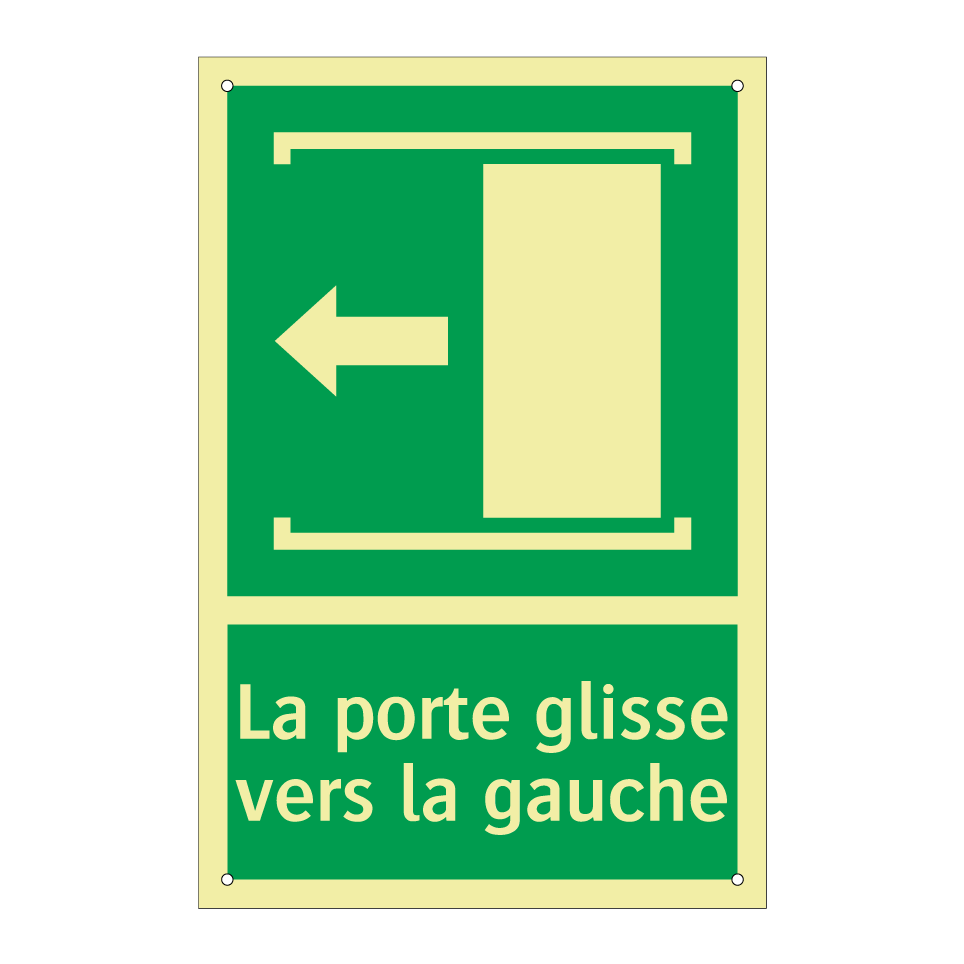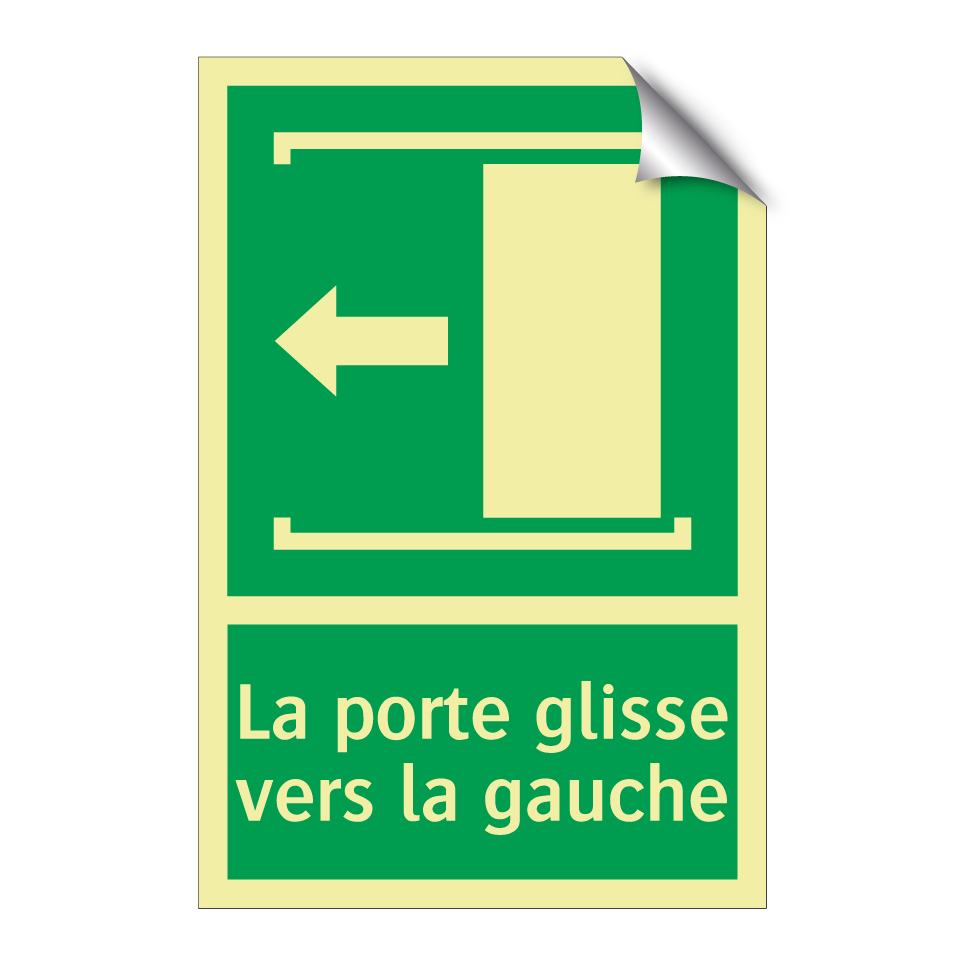 Panneau de secours avec le texte La porte glisse vers la gauche et une symbolique claire