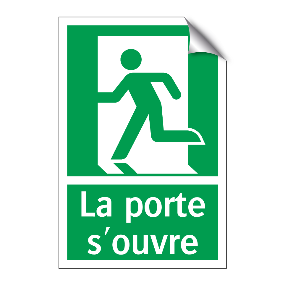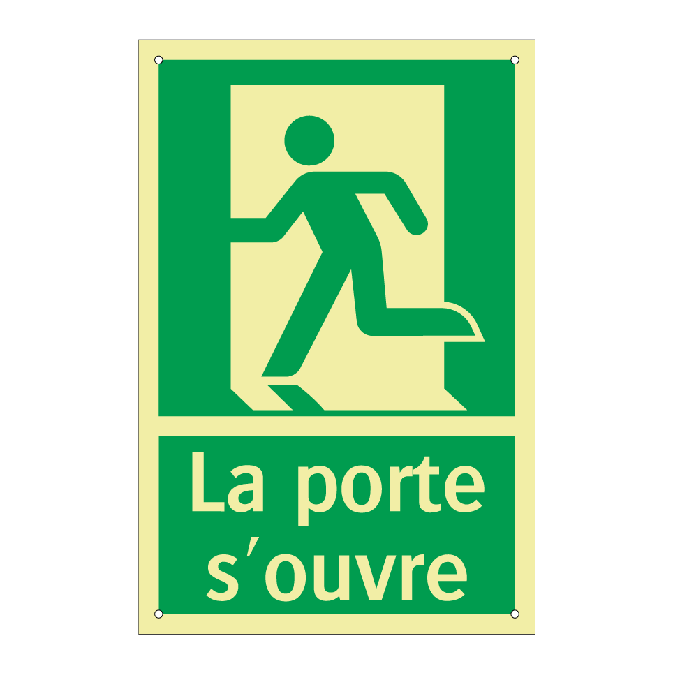 Panneau de secours avec le texte La porte s'ouvre et une symbolique claire