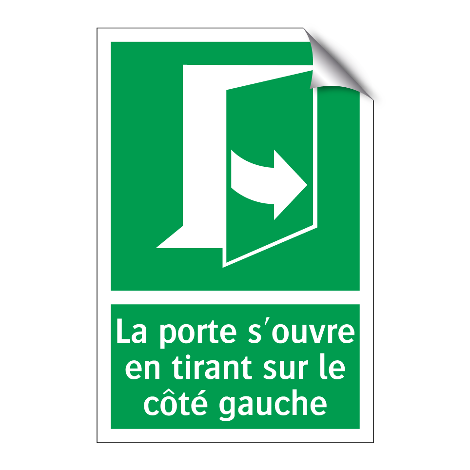 Panneau de secours avec le texte La porte s'ouvre en tirant sur le côté gauche et une symbolique claire