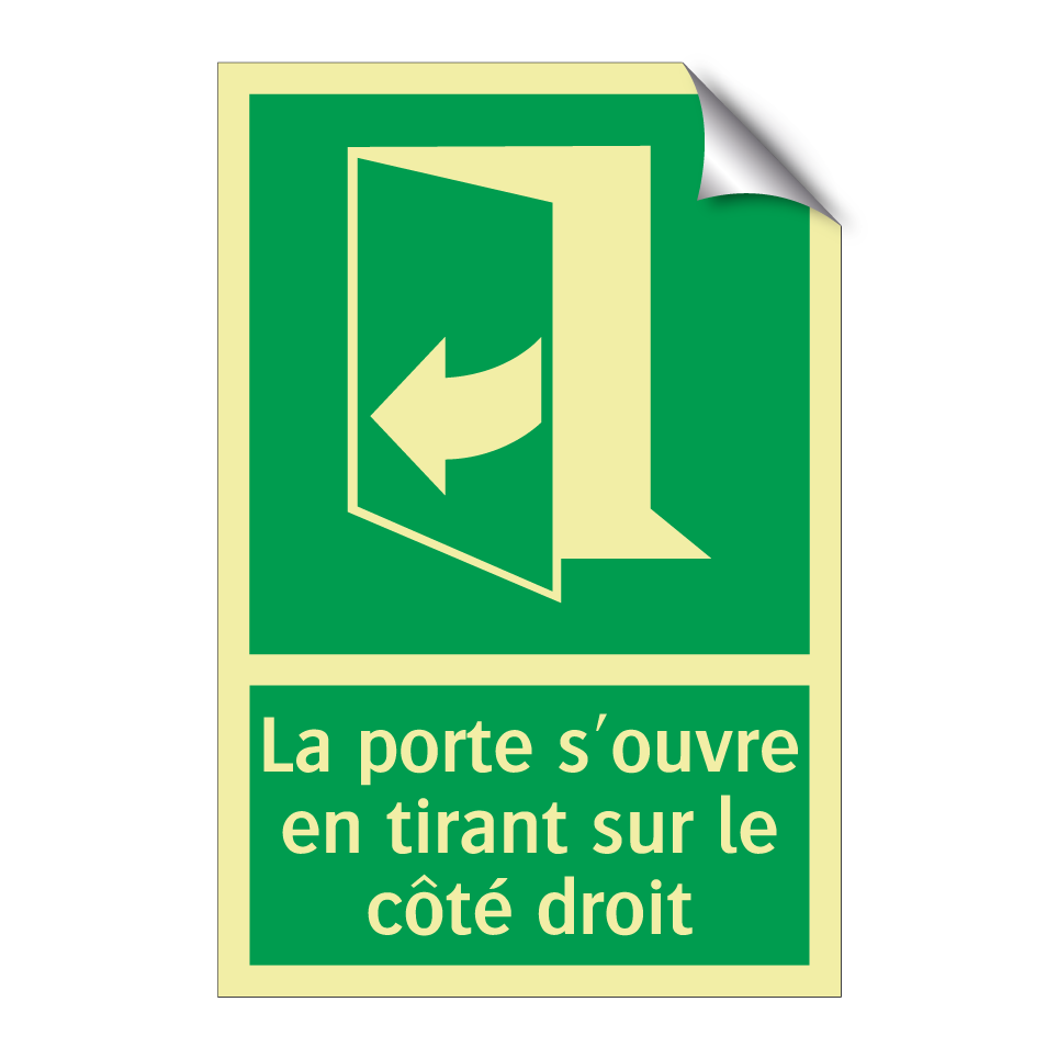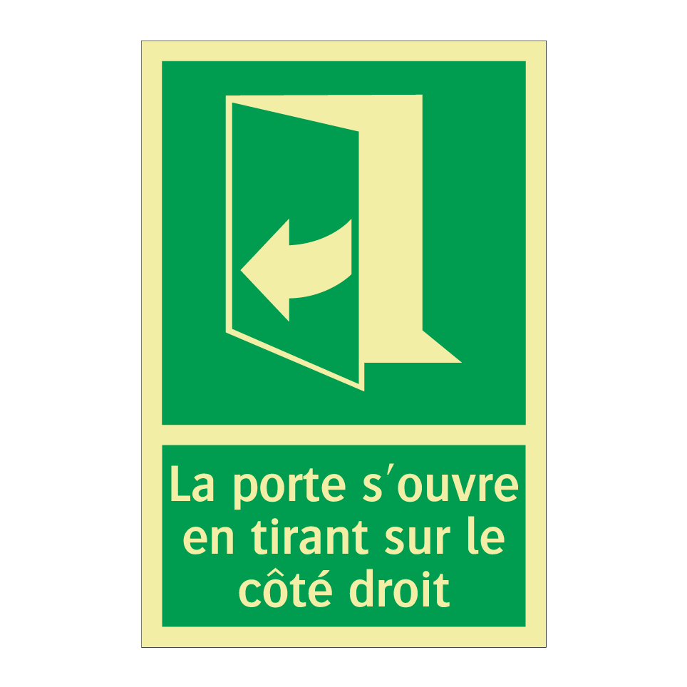 Panneau de secours avec le texte La porte s'ouvre en tirant sur le côté droit et une symbolique claire