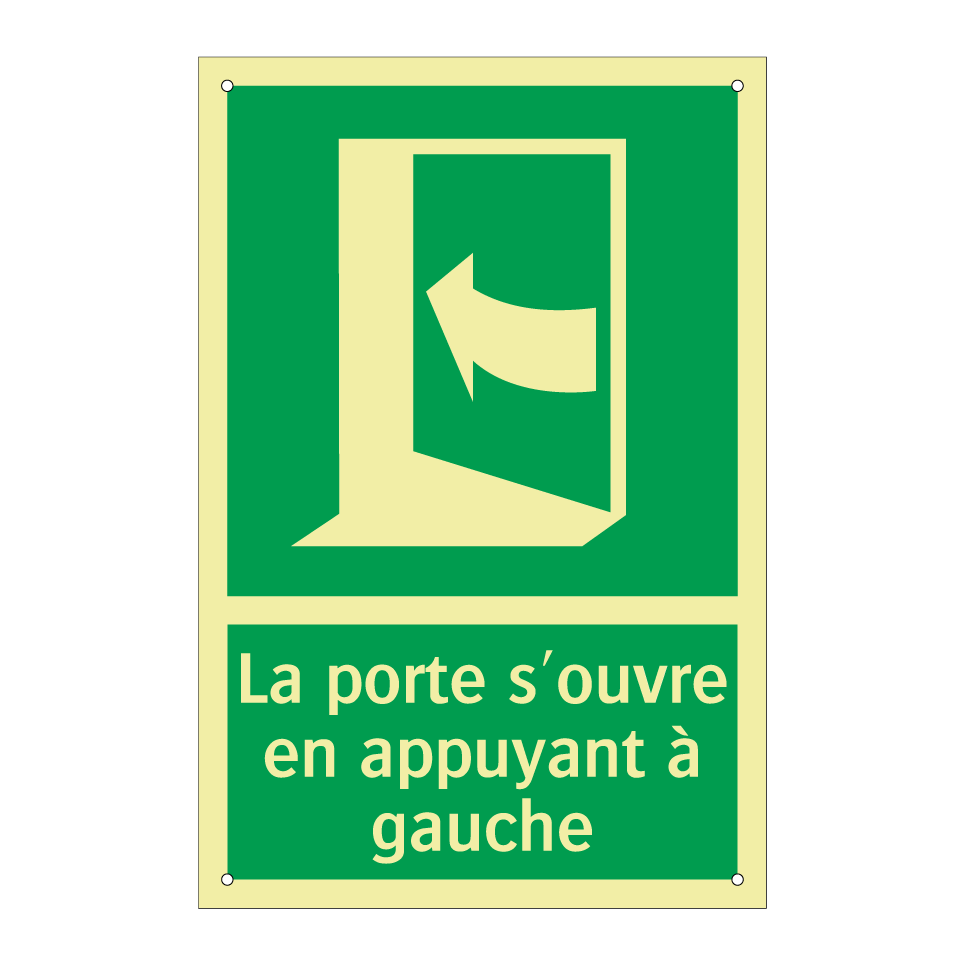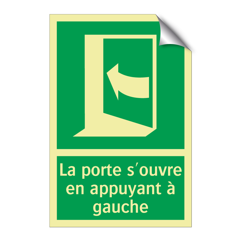 Panneau de secours avec le texte La porte s'ouvre en appuyant à gauche et une symbolique claire