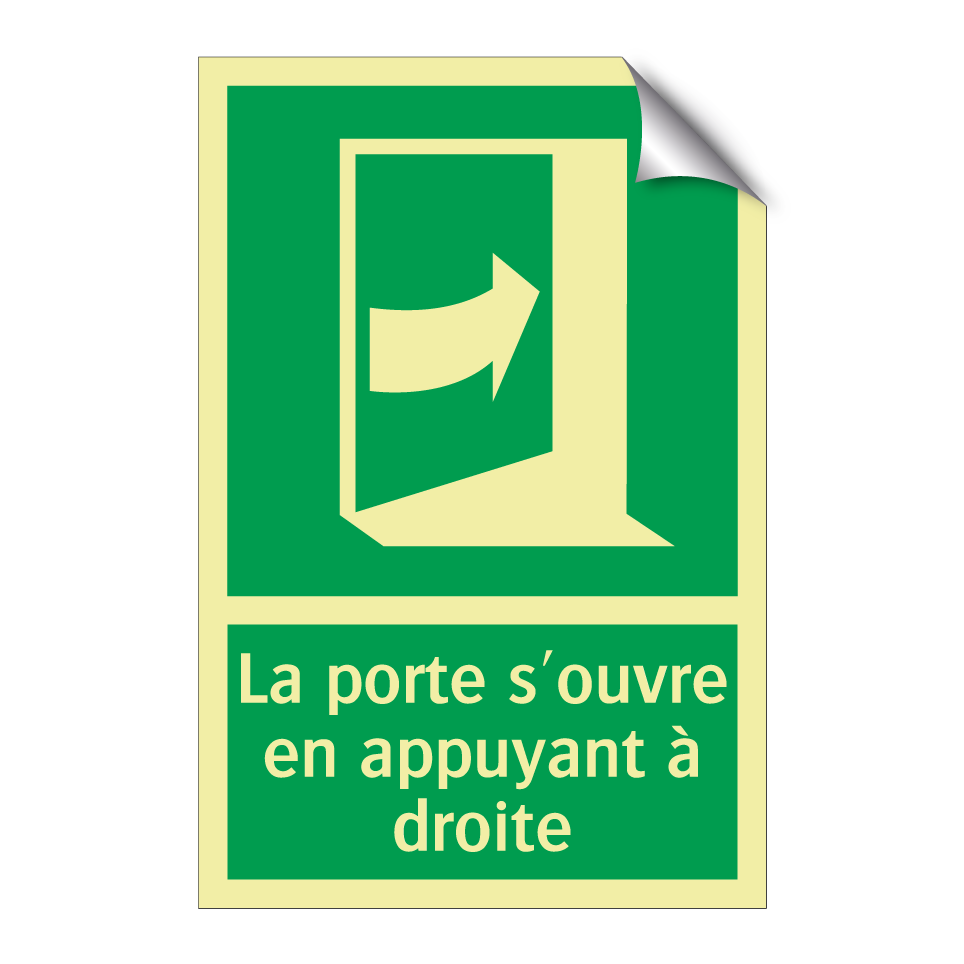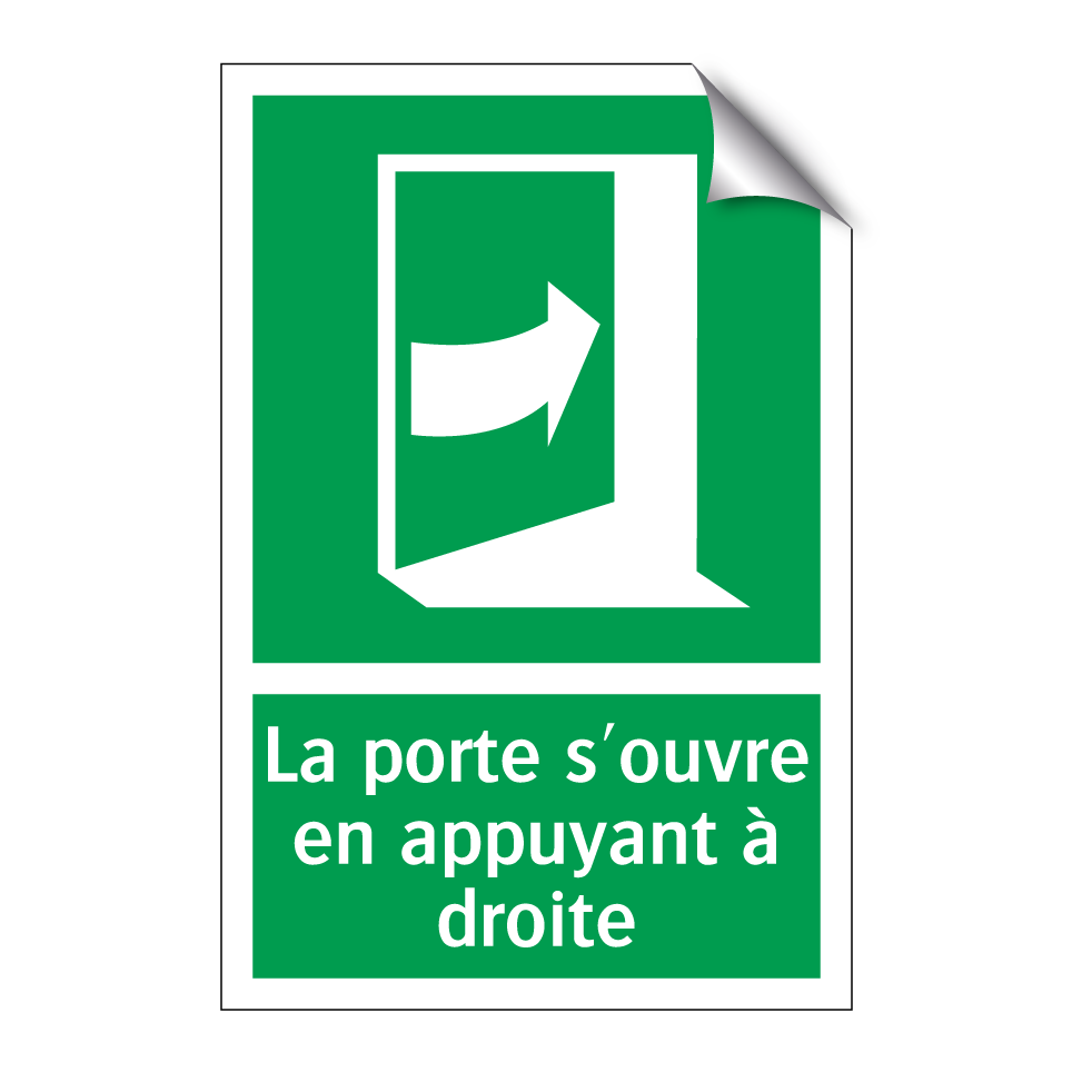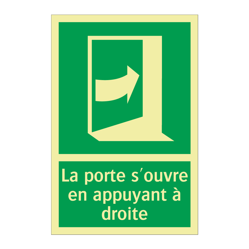Panneau de secours avec le texte La porte s'ouvre en appuyant à droite et une symbolique claire