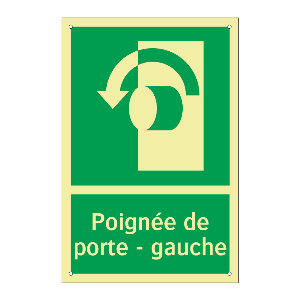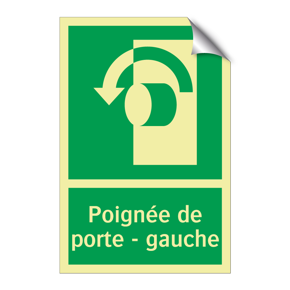 Panneau de secours avec le texte Poignée de porte - gauche et une symbolique claire