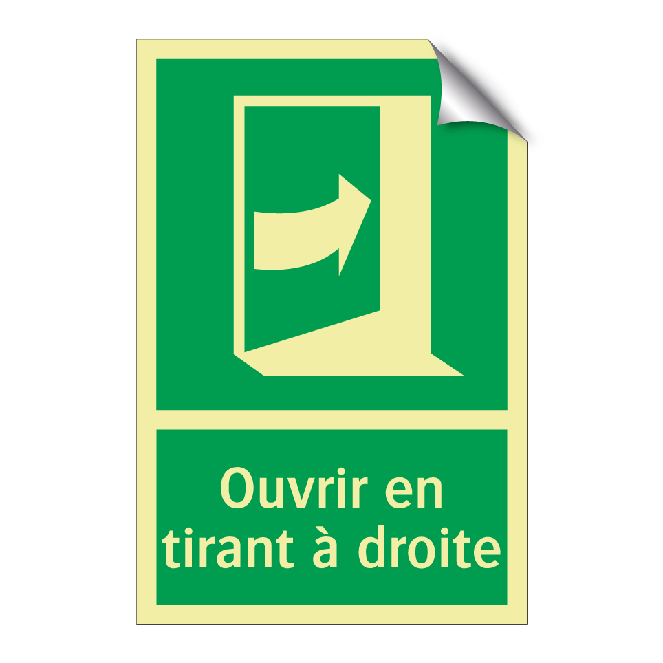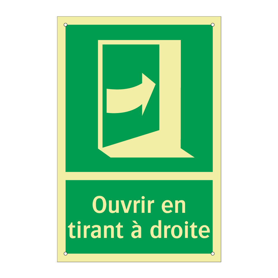 Panneau de secours avec le texte Ouvrir en tirant à droite et une symbolique claire