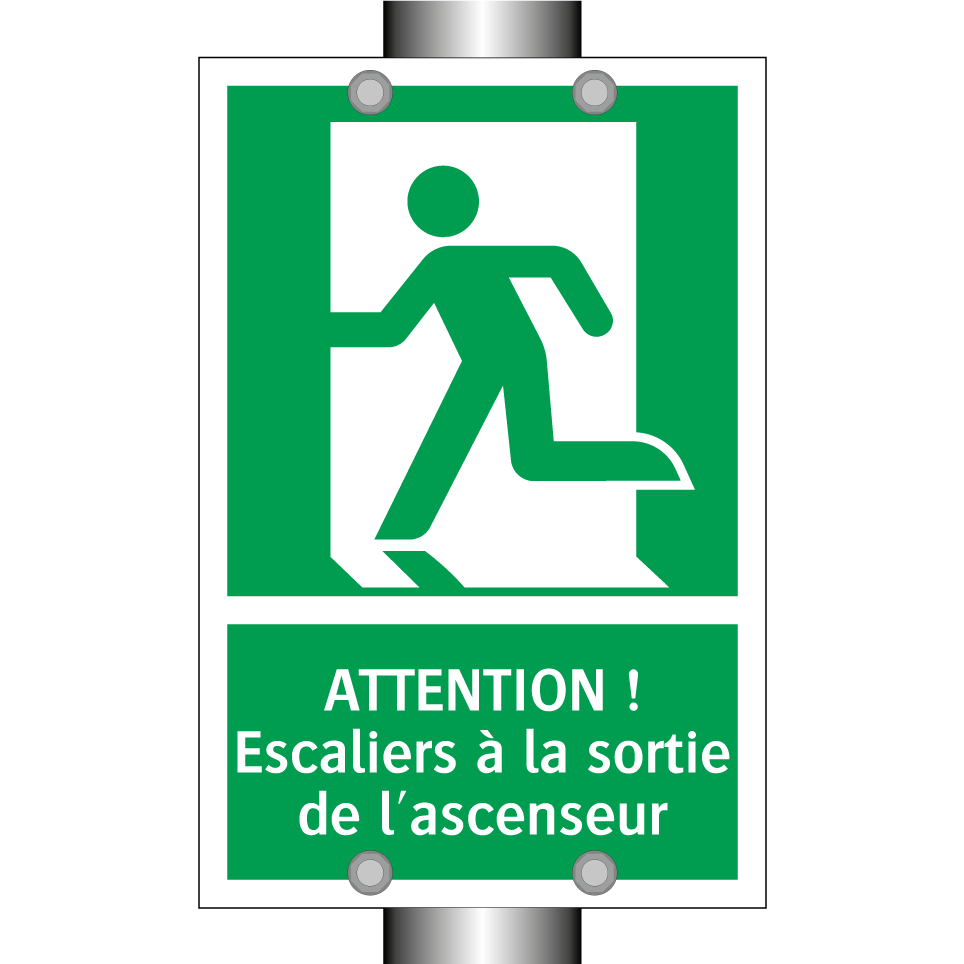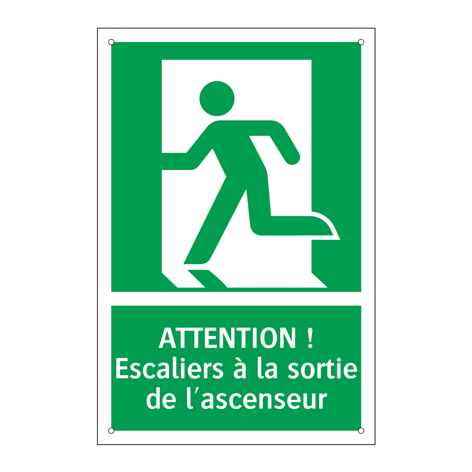 Cette pancarte de sécurité est idéale pour être placée à proximité des ascenseurs, signalant la présence d'escaliers à la sortie. Elle est conçue pour garantir la sécurité des usagers en les avertissant des dangers potentiels. Grâce à sa couleur verte et son texte blanc, elle est facilement repérable dans les environnements publics tels que les immeubles de bureaux, les centres commerciaux et les complexes résidentiels. La symbolique claire renforce le message, assurant une compréhension immédiate, même pour ceux qui ne parlent pas couramment le français. Cette signalisation est essentielle pour prévenir les accidents et assurer une circulation fluide et sécurisée.
