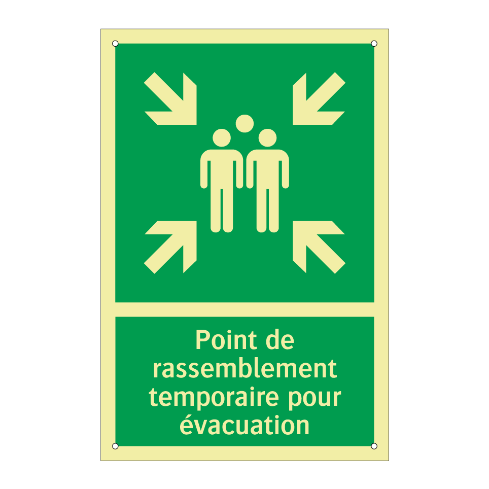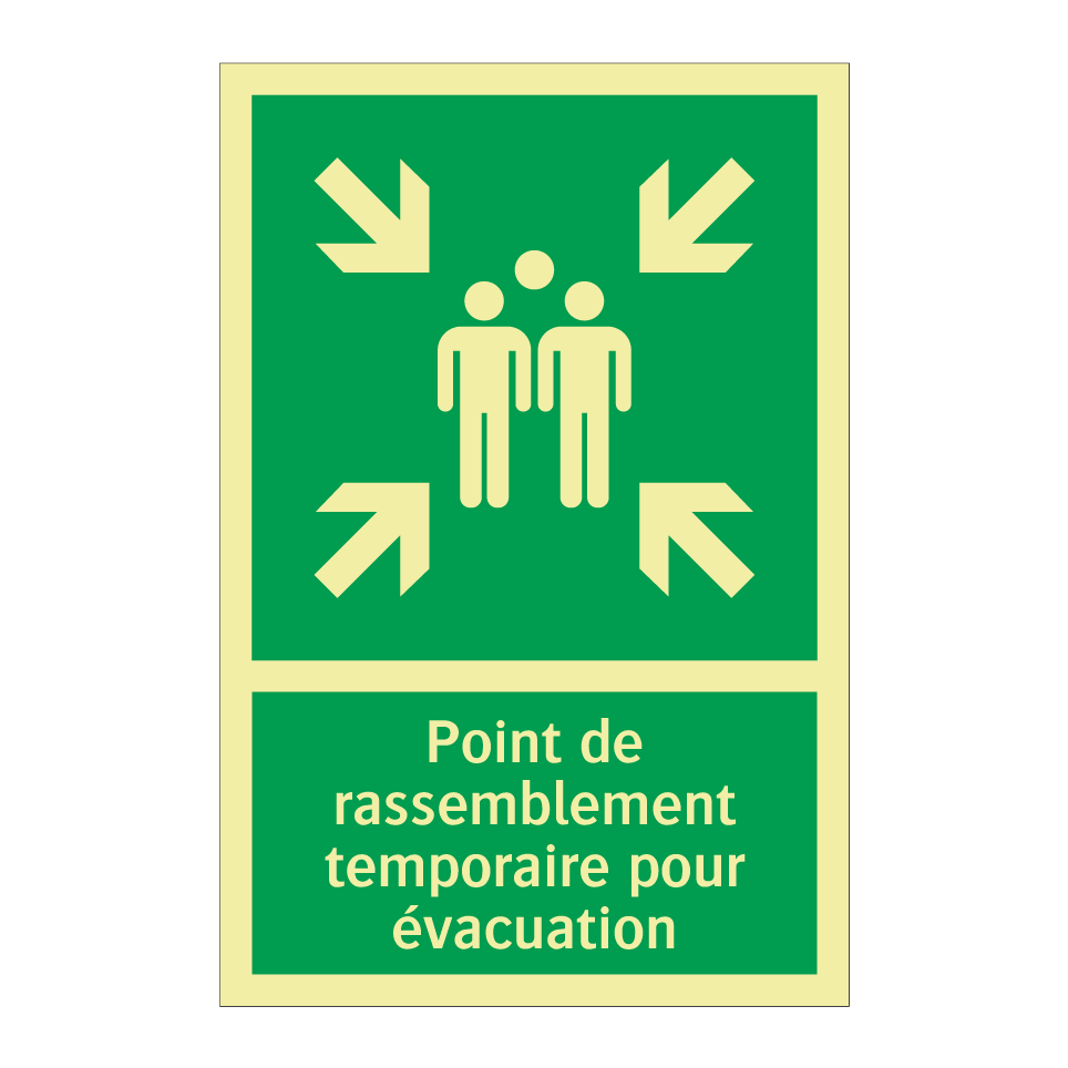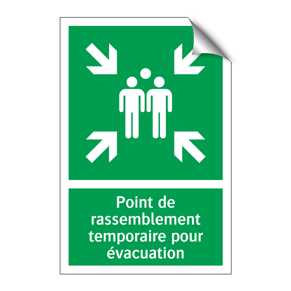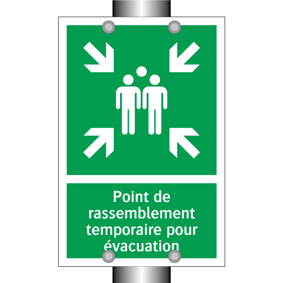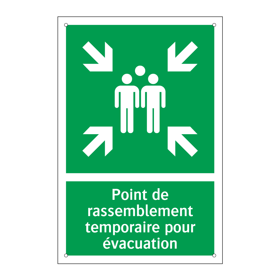 Panneau de secours avec le texte Point de rassemblement temporaire pour évacuation et une symbolique claire