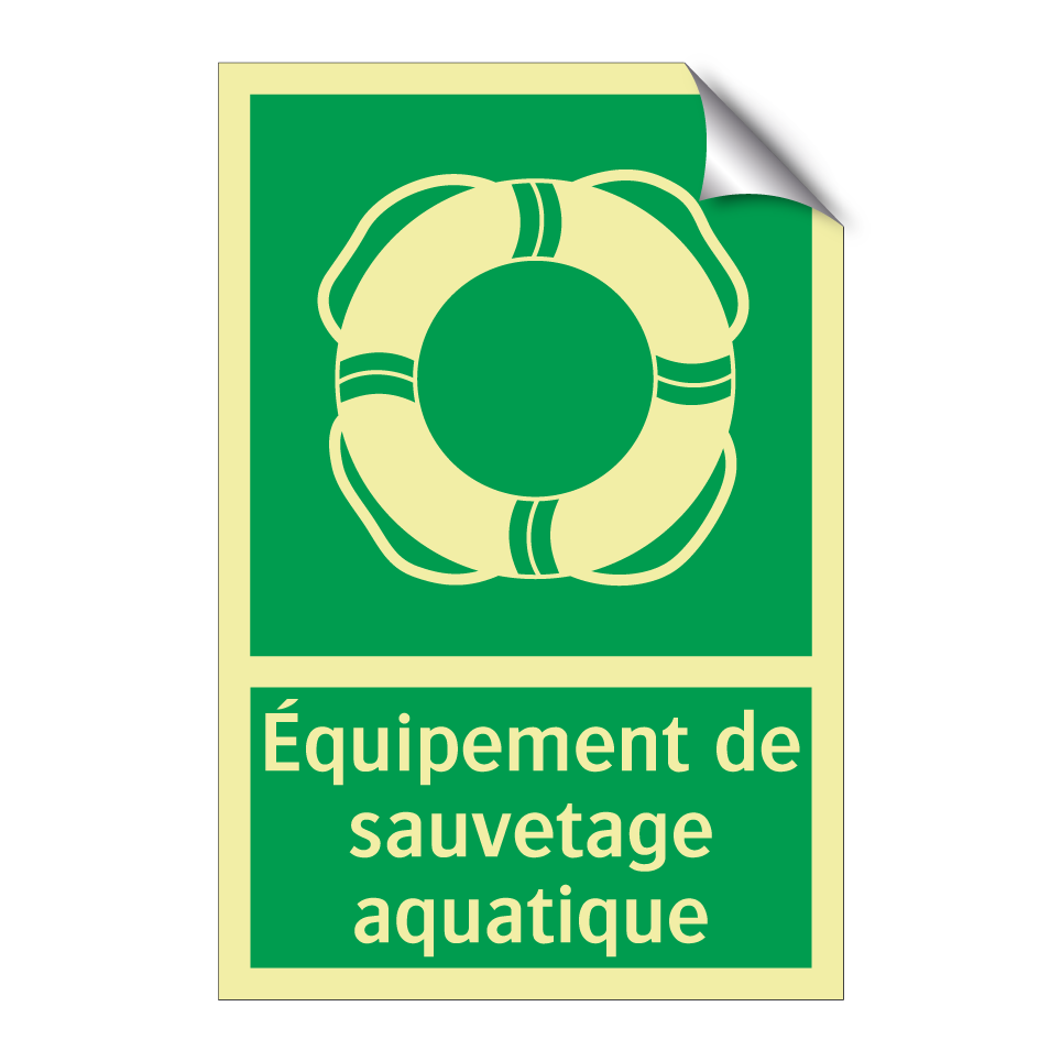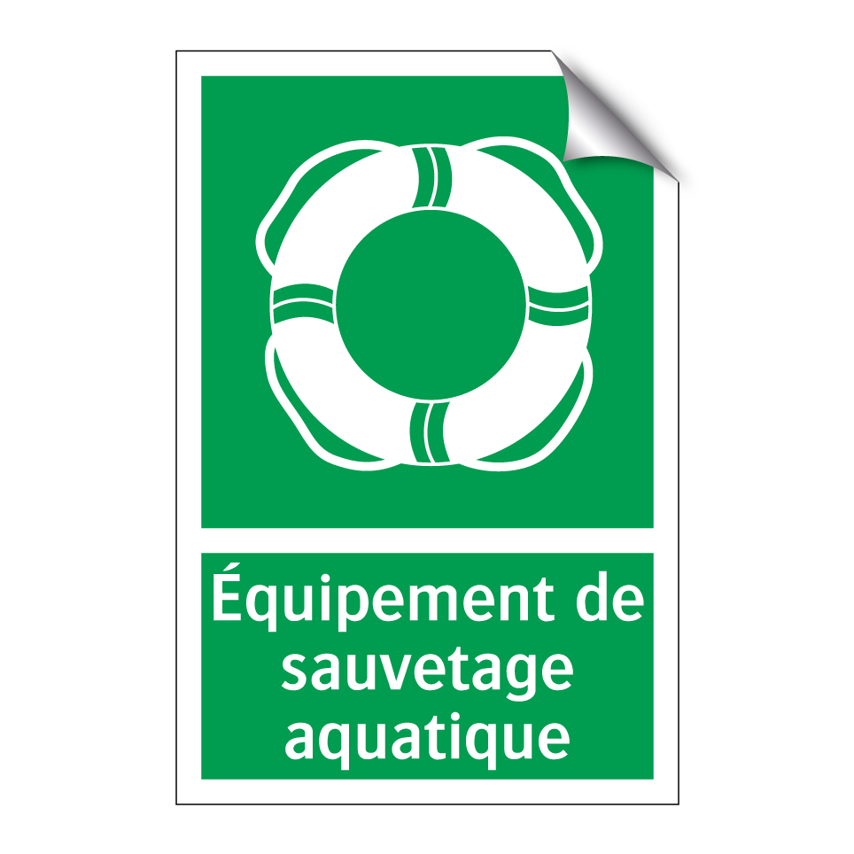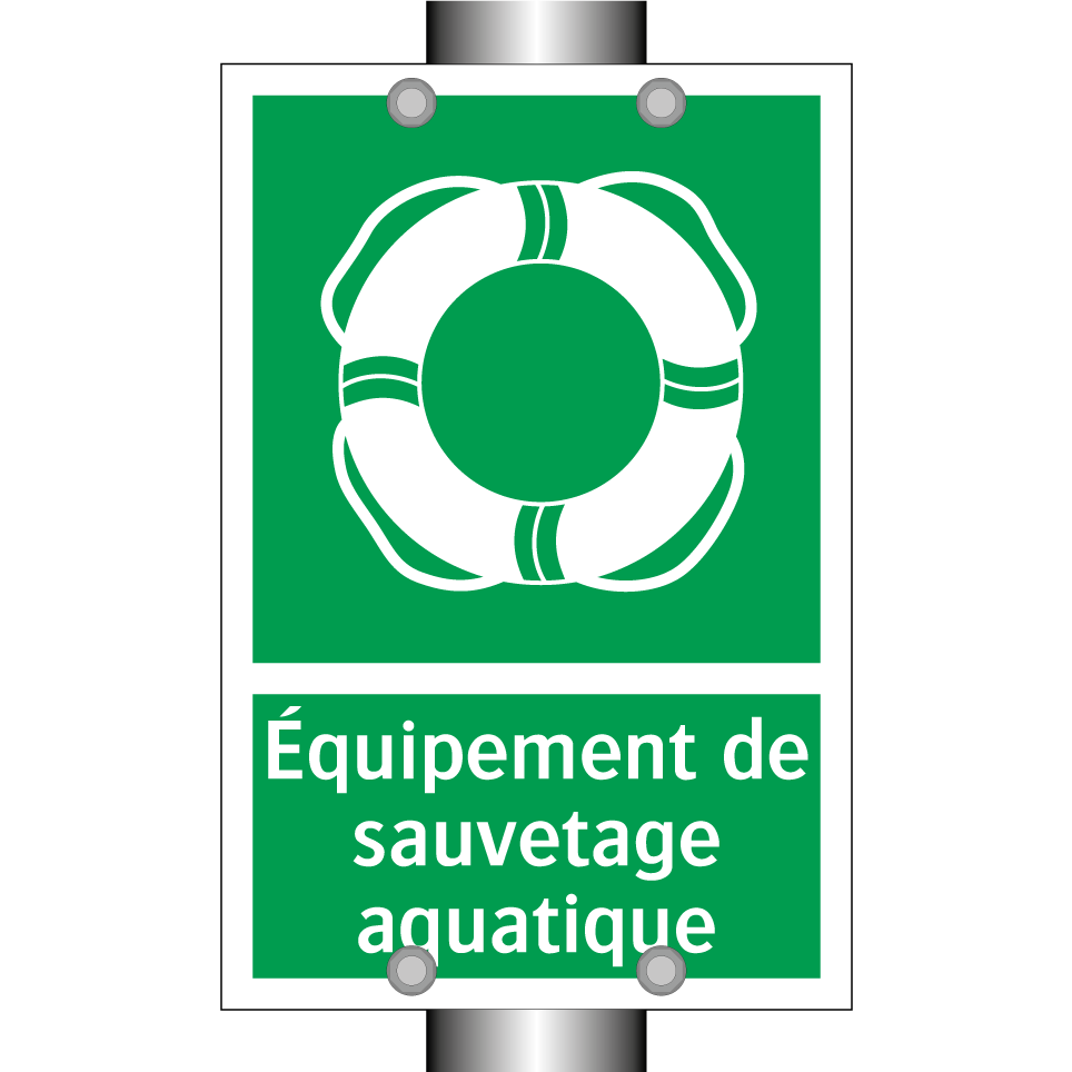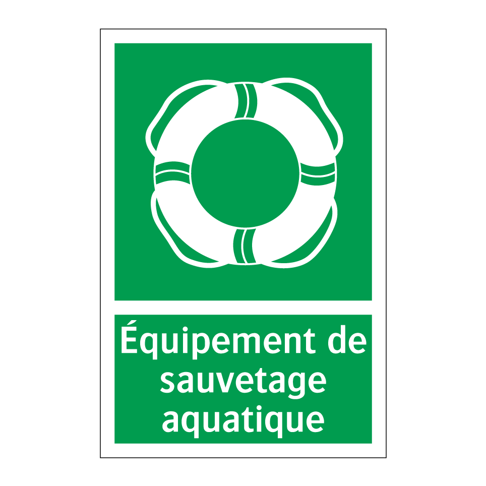 Panneau de secours avec le texte Équipement de sauvetage aquatique et une symbolique claire