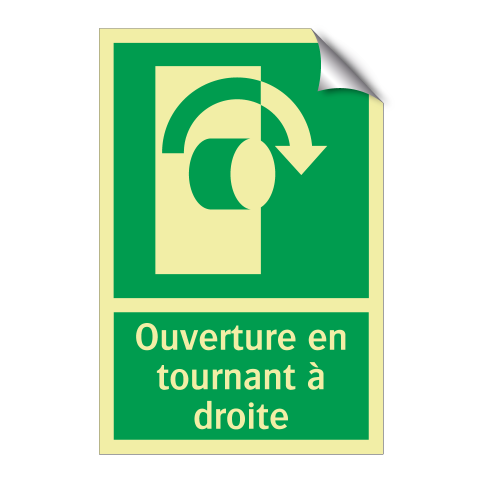 Panneau de secours avec le texte Ouverture en tournant à droite et une symbolique claire