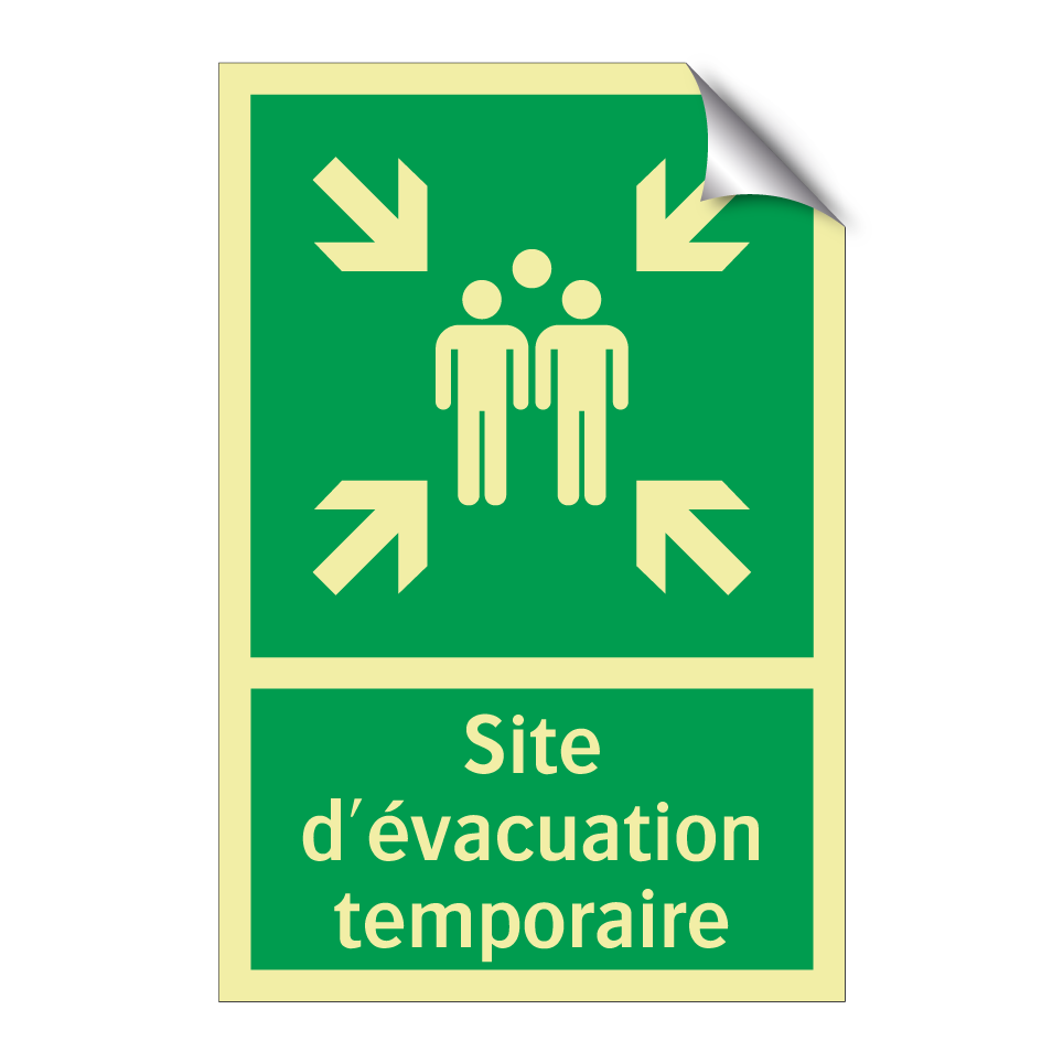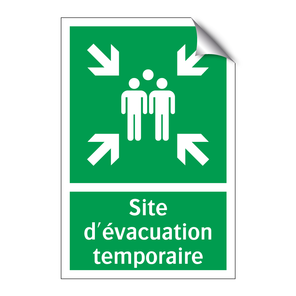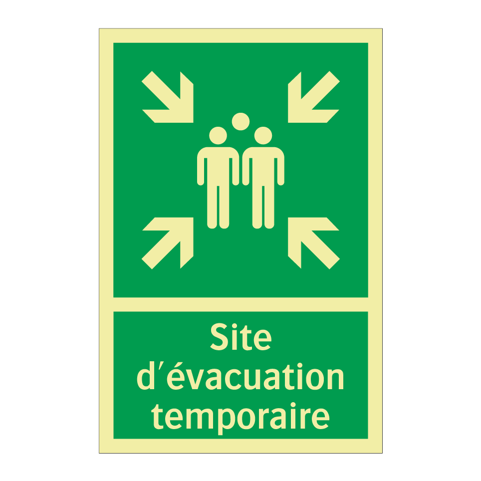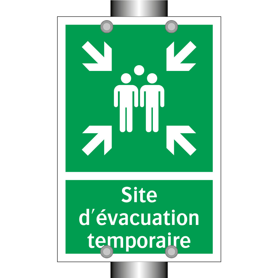 Panneau de secours avec le texte Site d'évacuation temporaire et une symbolique claire