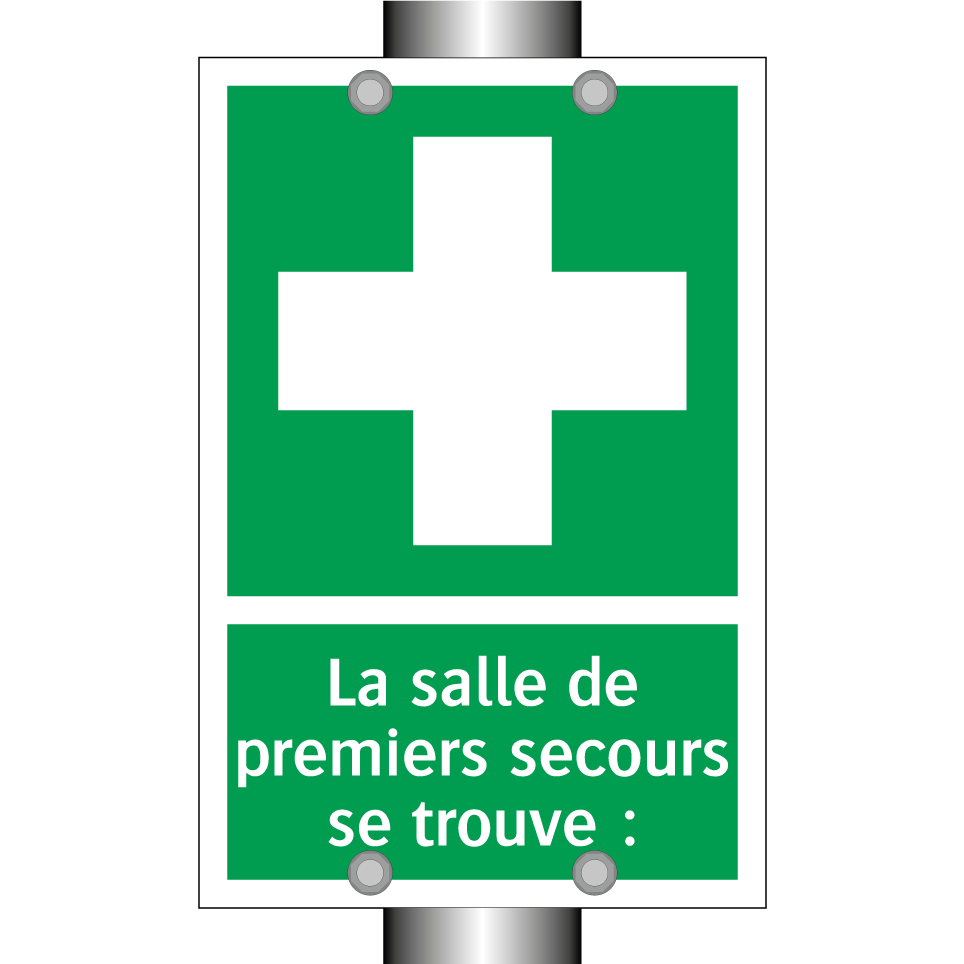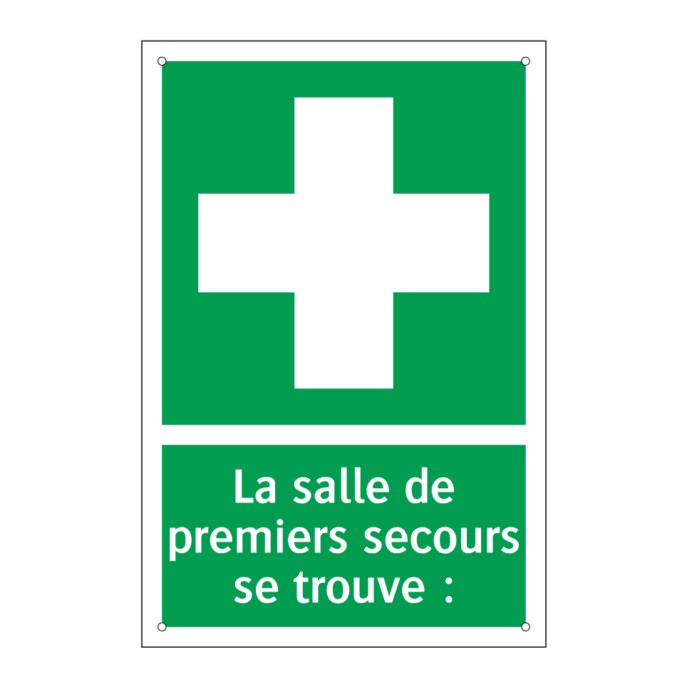 Panneau de secours avec le texte La salle de premiers secours se trouve : et une symbolique claire