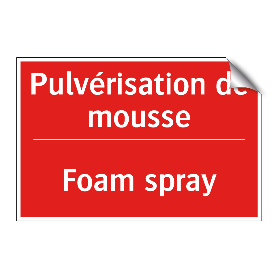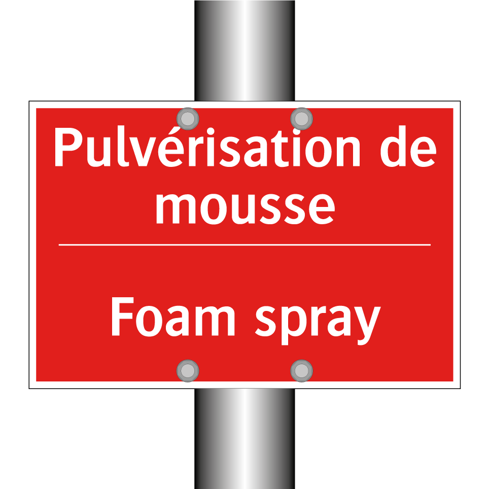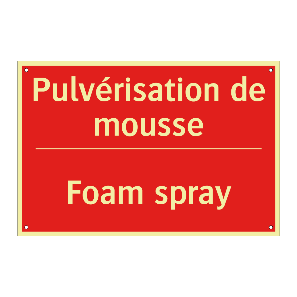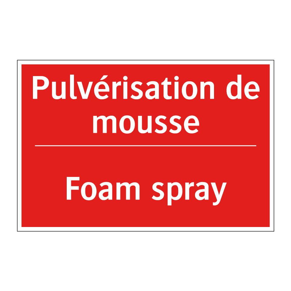 Panneau de signalisation incendie bilingue avec texte en français : "Pulvérisation de mousse", et en anglais : "Foam spray"