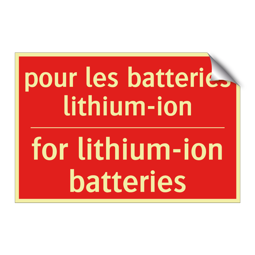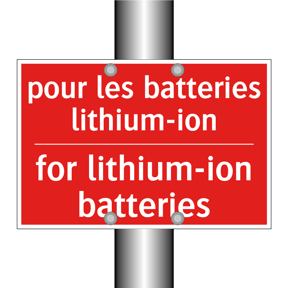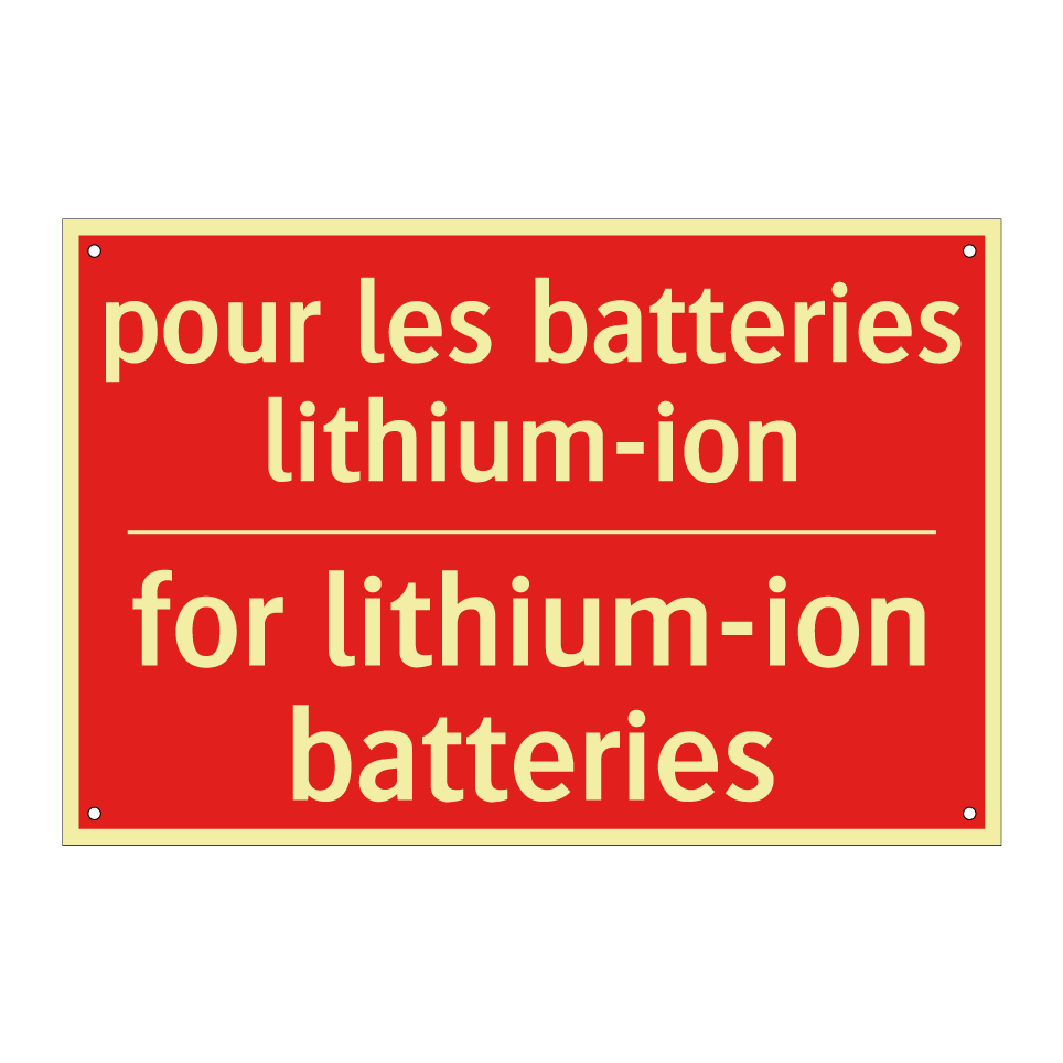Panneau de signalisation incendie bilingue avec texte en français : "pour les batteries lithium-ion", et en anglais : "for lithium-ion batteries"