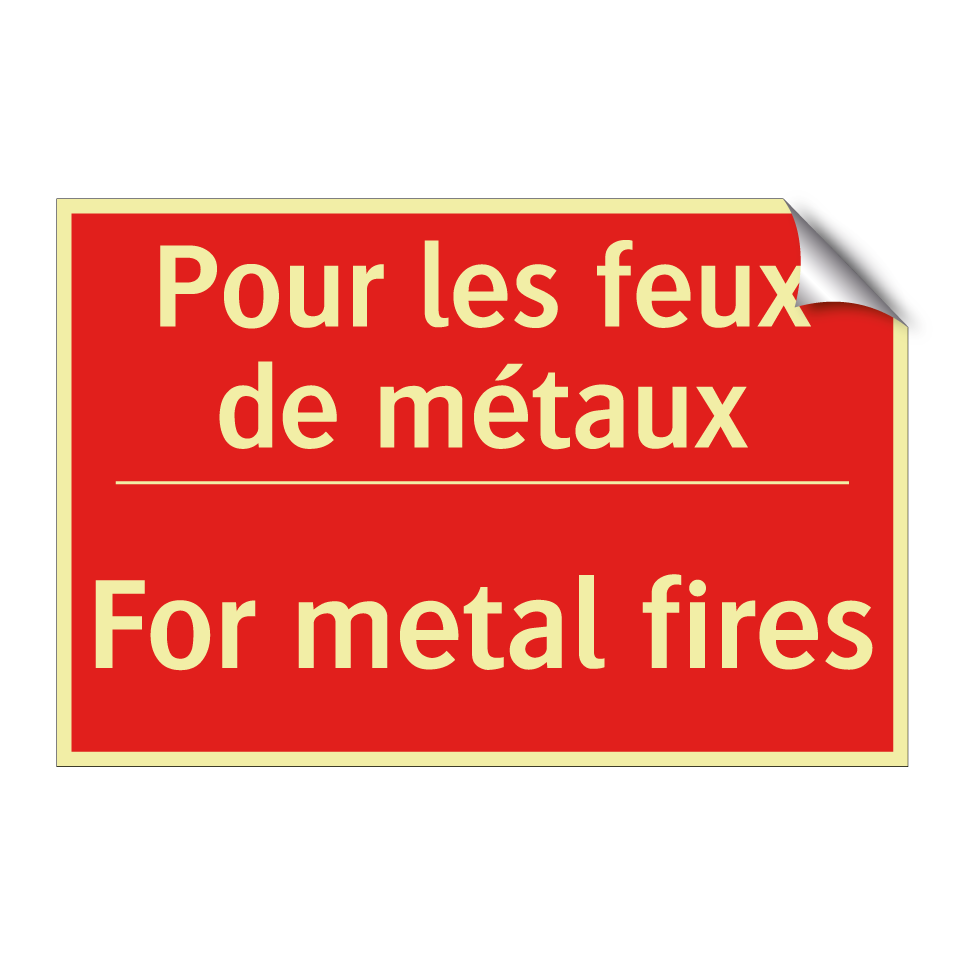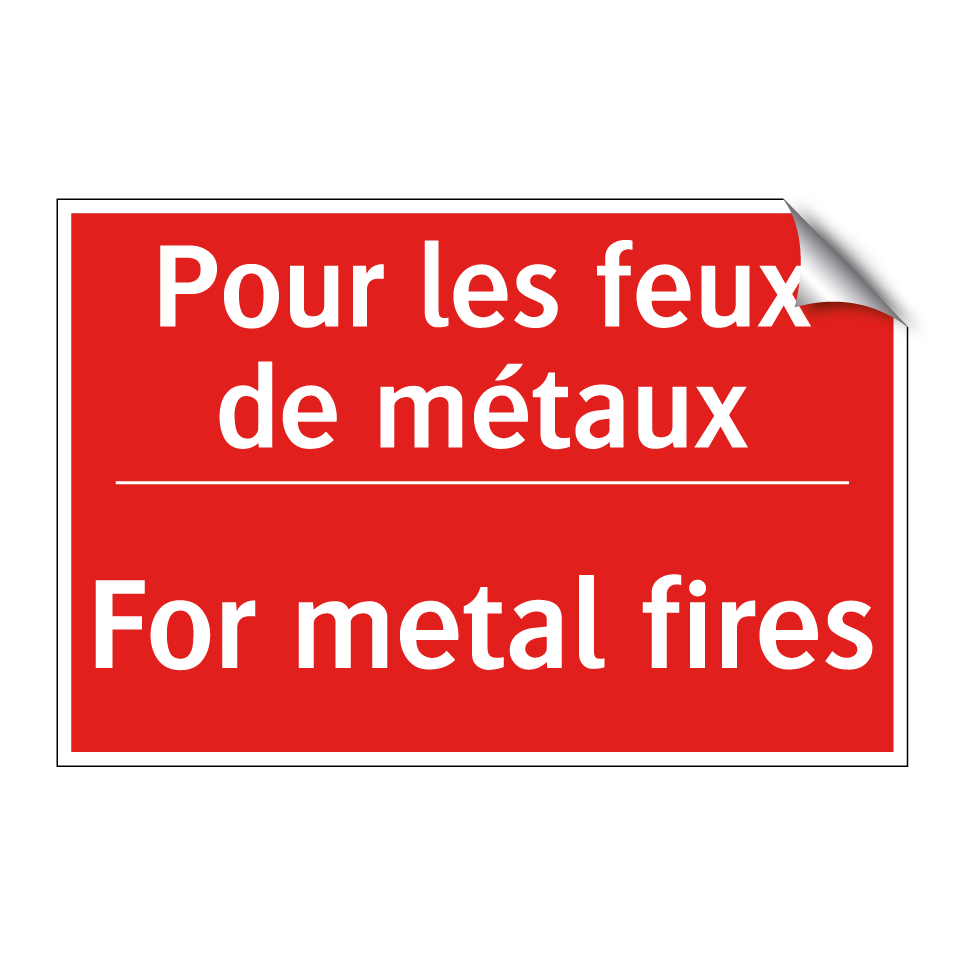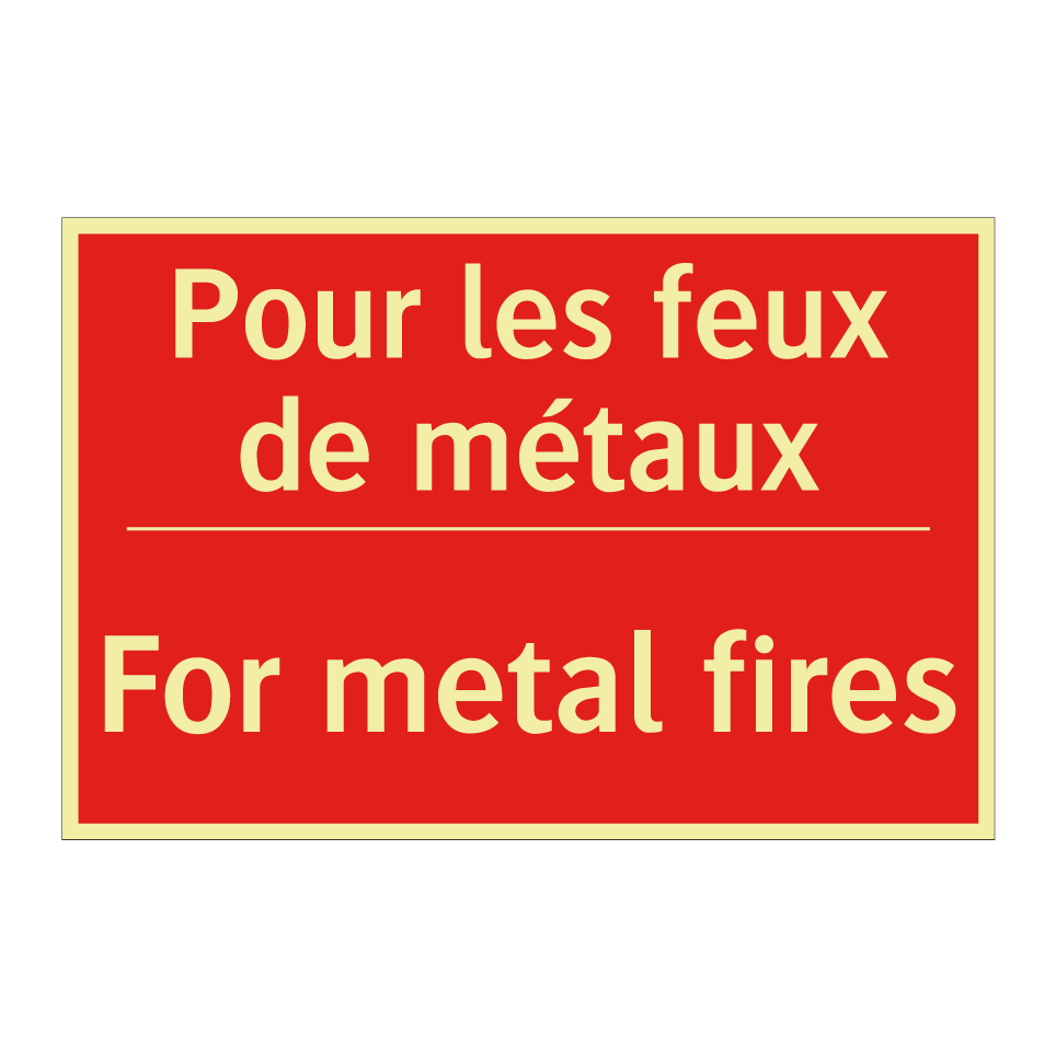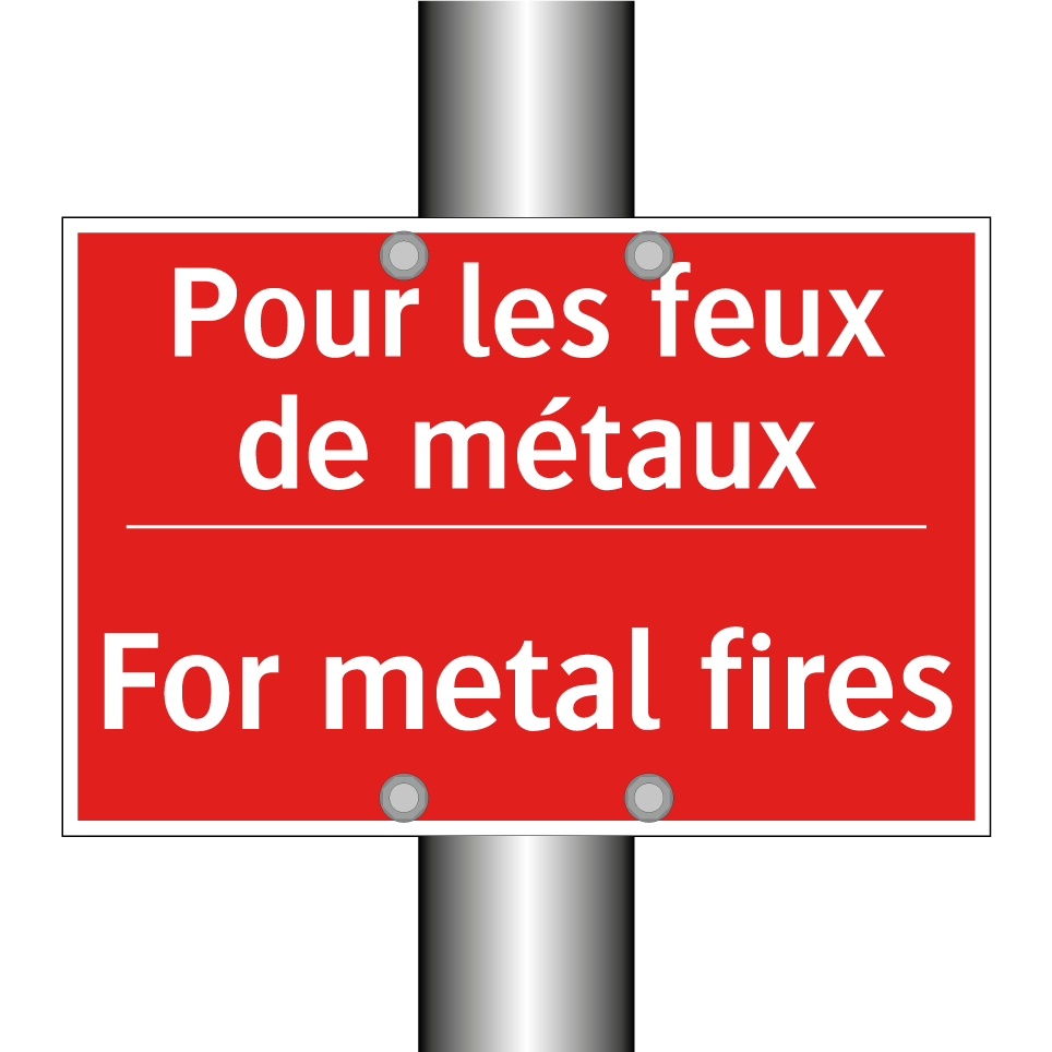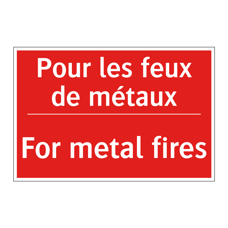 Panneau de signalisation incendie bilingue avec texte en français : "Pour les feux de métaux", et en anglais : "For metal fires"