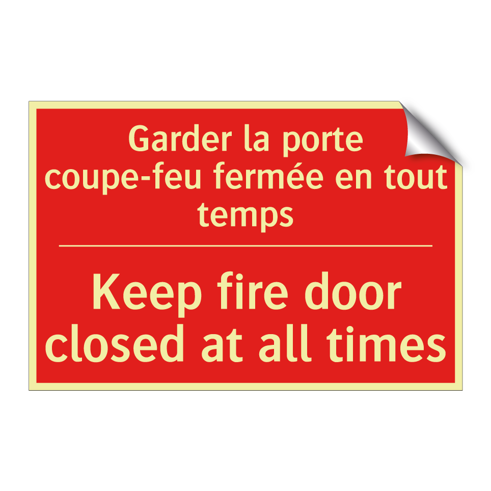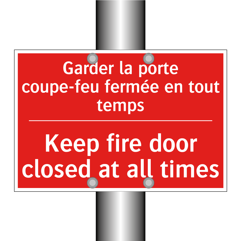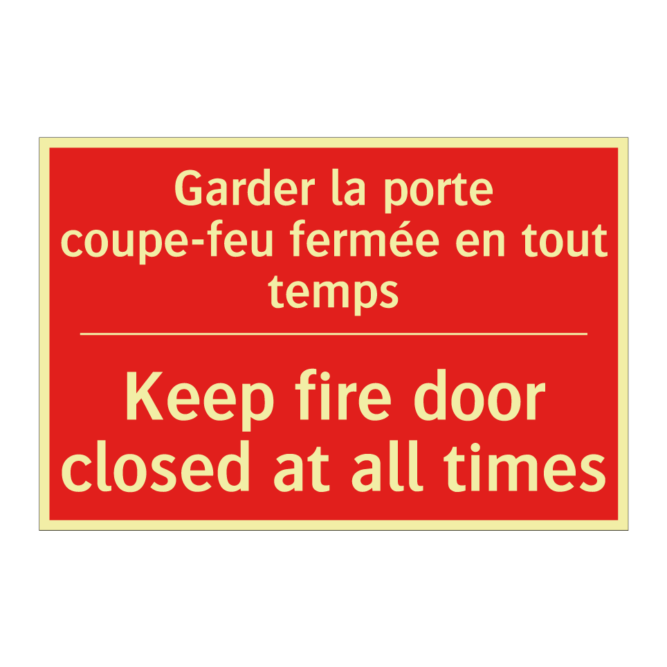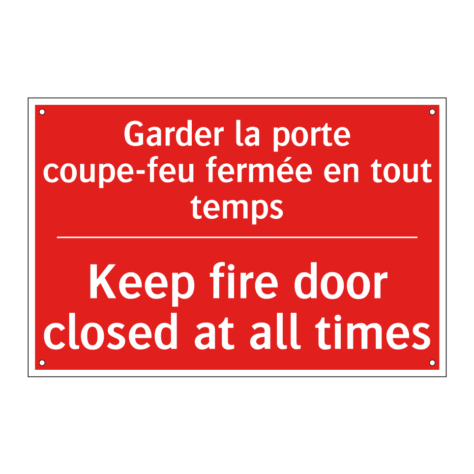 Panneau de signalisation incendie bilingue avec texte en français : "Garder la porte coupe-feu fermée en tout temps", et en anglais : "Keep fire door closed at all times"