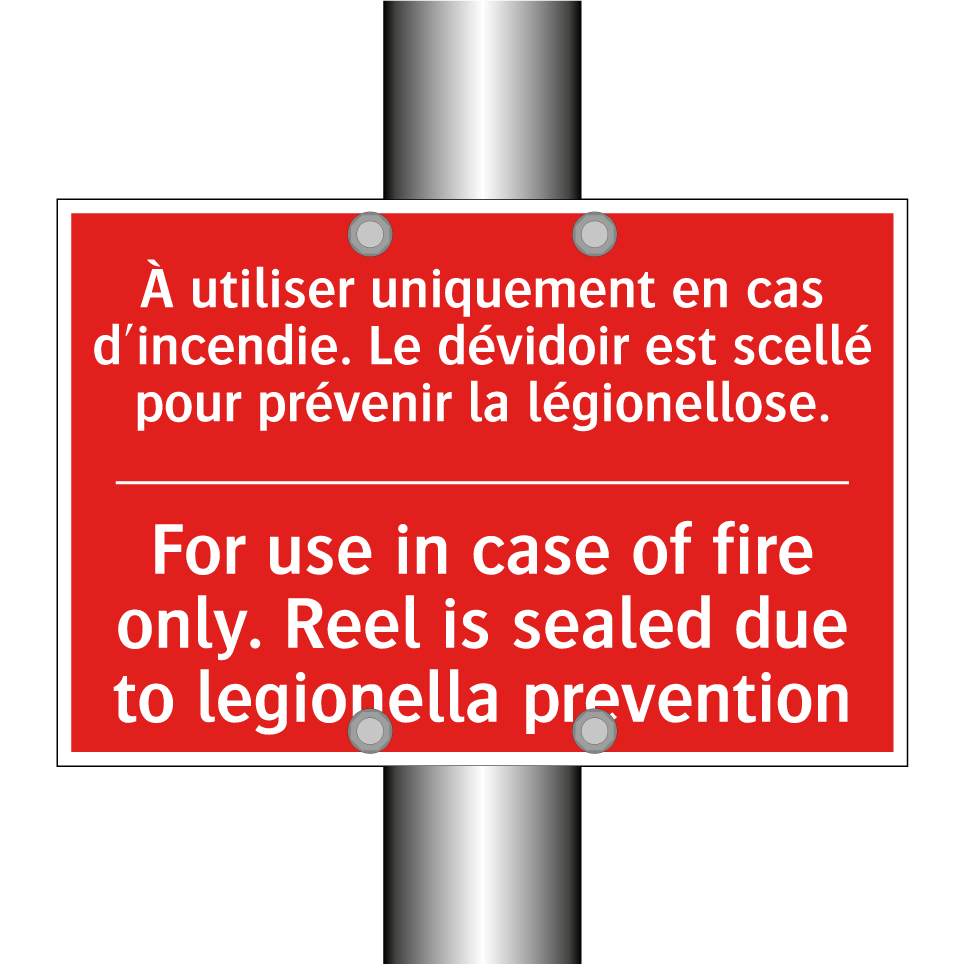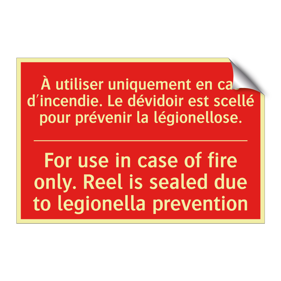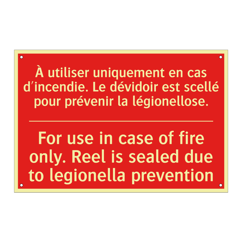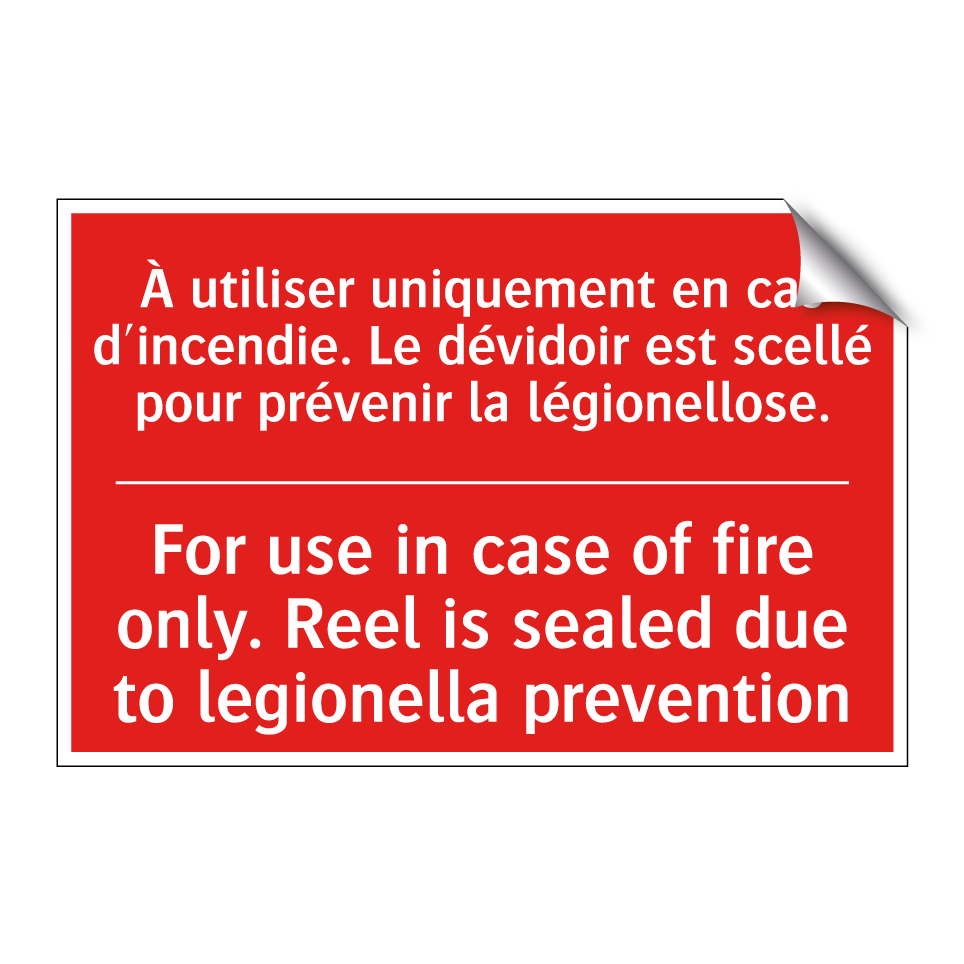 Panneau de signalisation incendie bilingue avec texte en français : "À utiliser uniquement en cas d'incendie. Le dévidoir est scellé pour prévenir la légionellose.", et en anglais : "For use in case of fire only. Reel is sealed due to legionella prevention"
