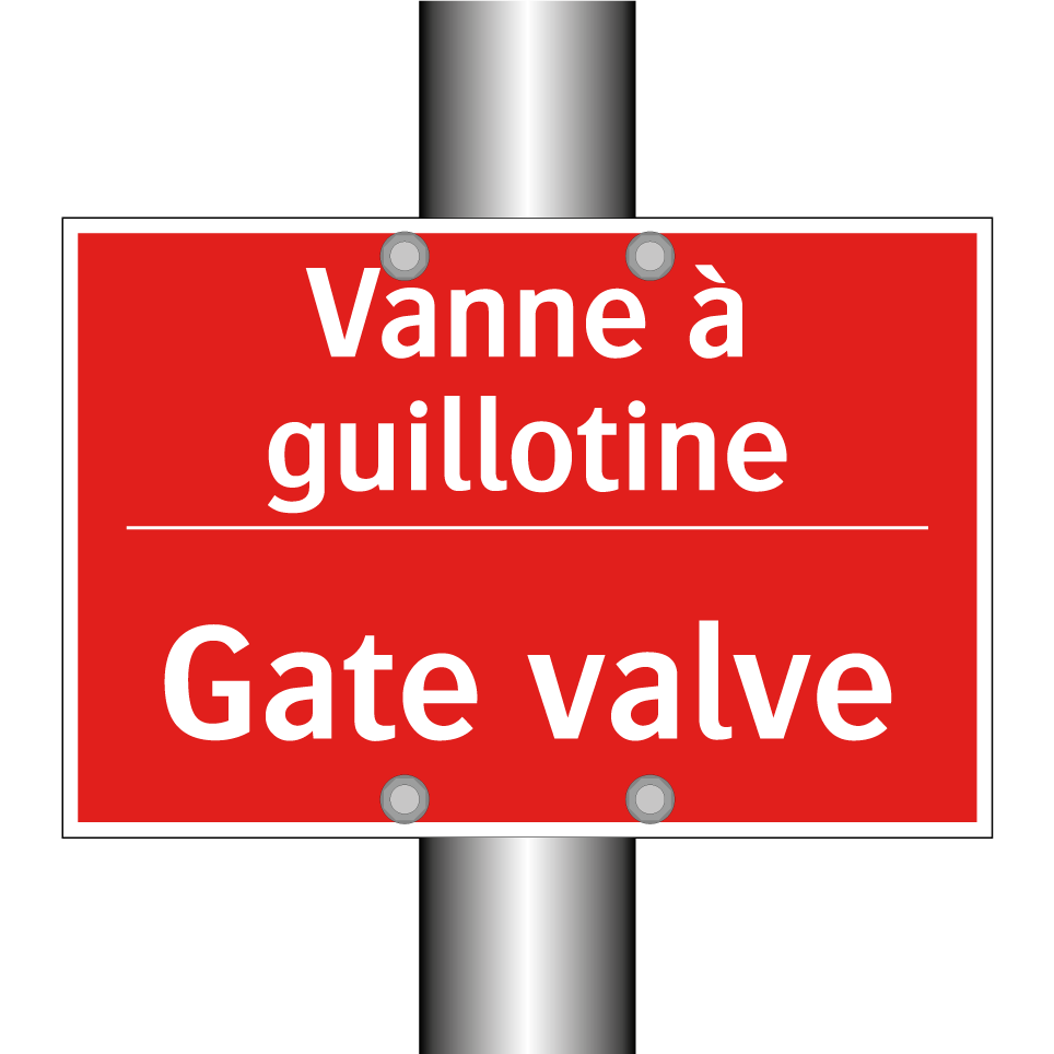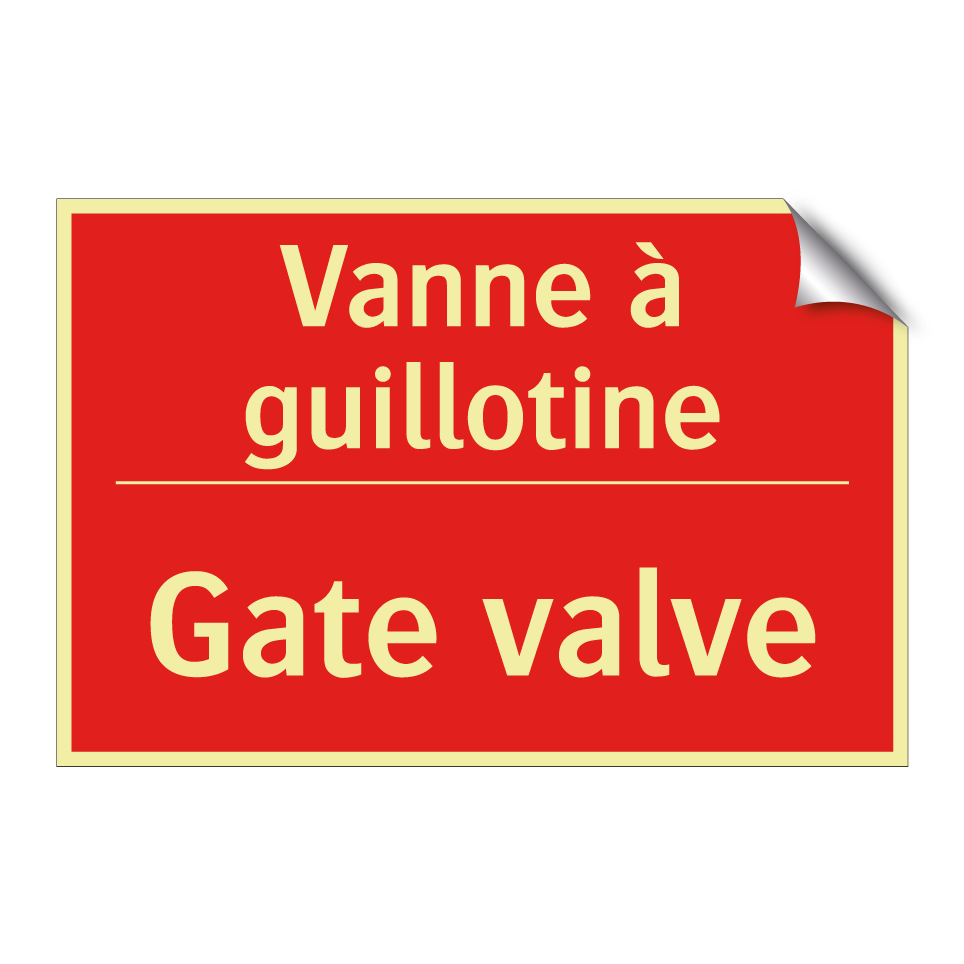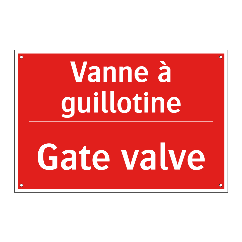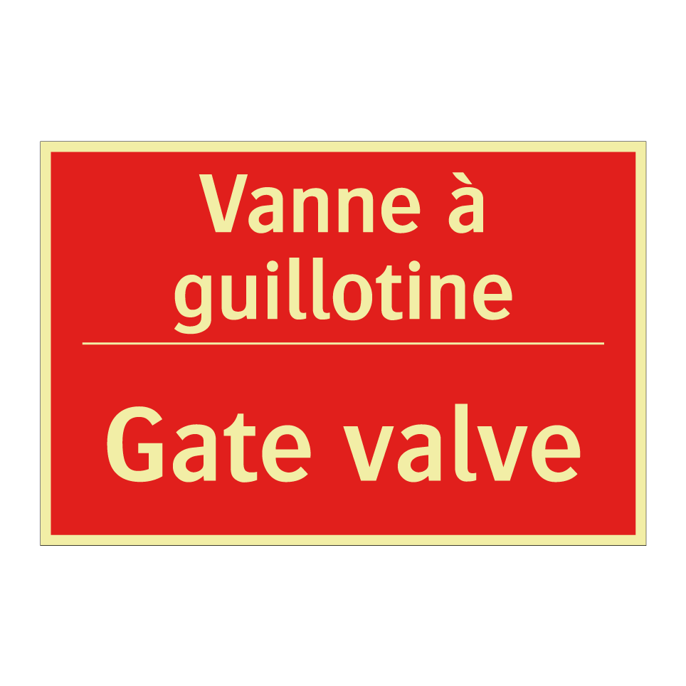 Panneau de signalisation incendie bilingue avec texte en français : "Vanne à guillotine", et en anglais : "Gate valve"