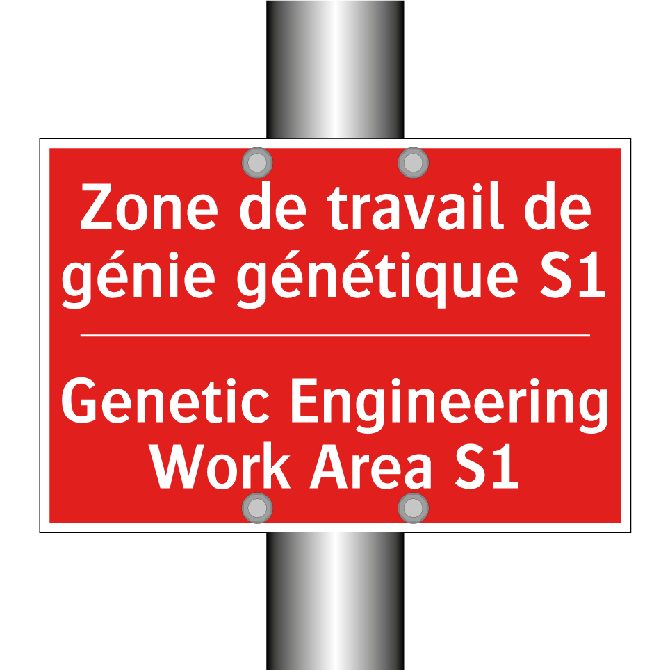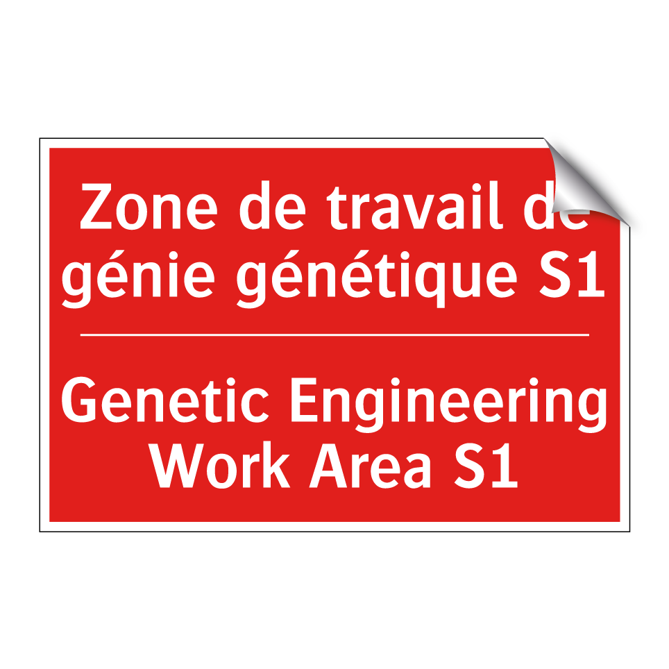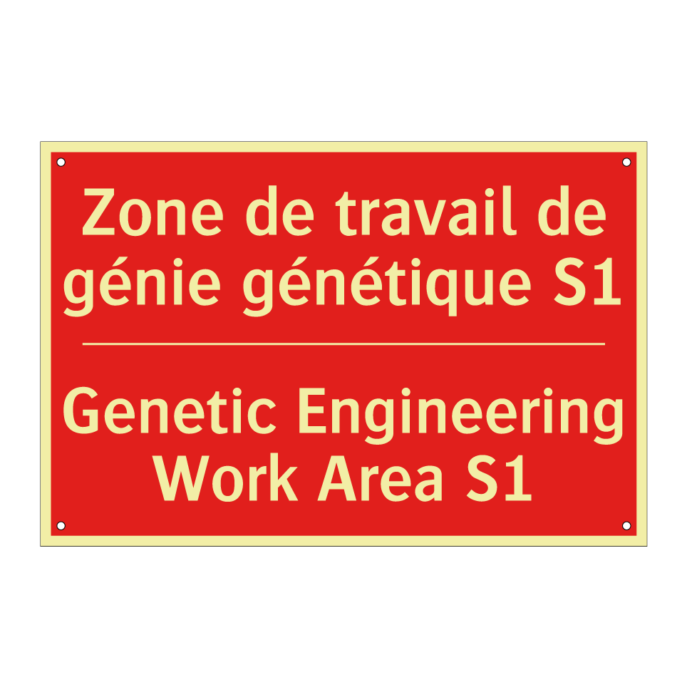 Panneau de signalisation incendie bilingue avec texte en français : "Zone de travail de génie génétique S1", et en anglais : "Genetic Engineering Work Area S1"