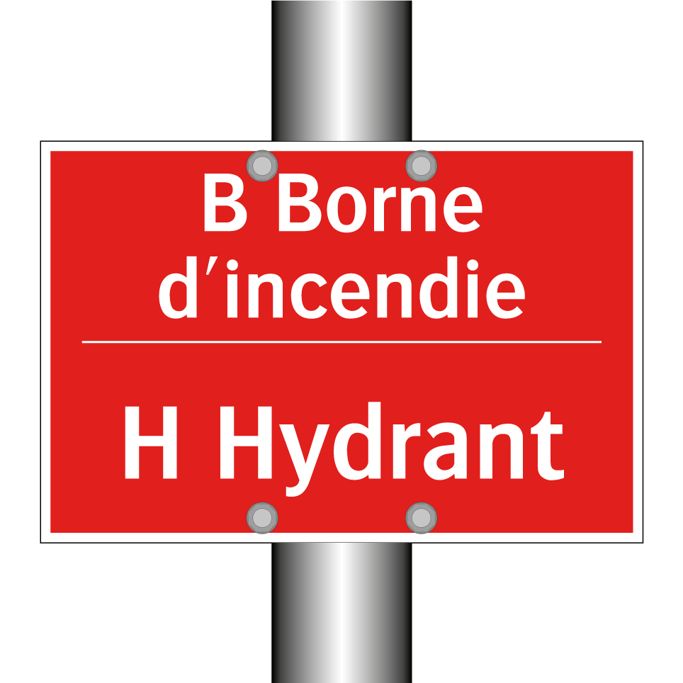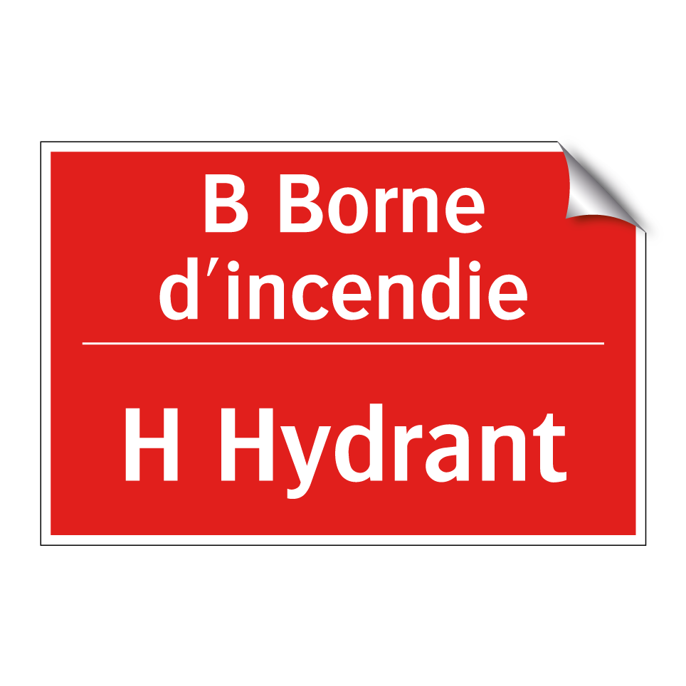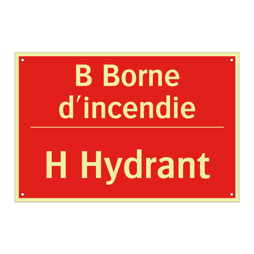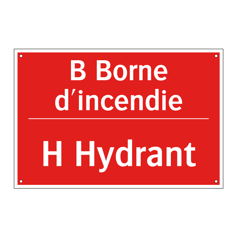 Panneau de signalisation incendie bilingue avec texte en français : "B Borne d'incendie", et en anglais : "H Hydrant"